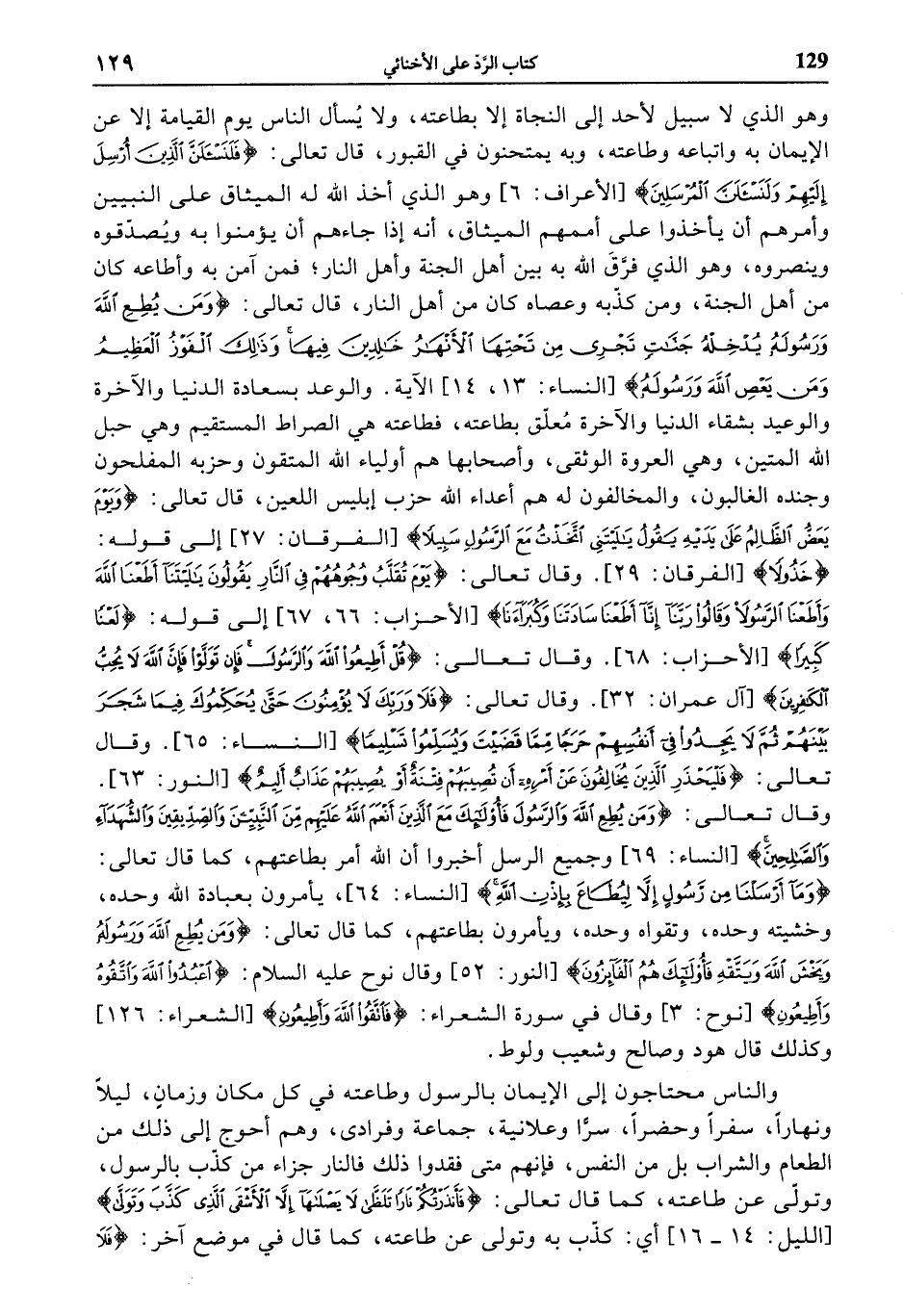 خَذُولًا [الفرقان: 29]. وقال تعالى: يَوْمَ تُقَلَّبُ وُجُوهُهُمْ فِي النَّارِ يَقُولُونَ يا لَيْتَنا أَطَعْنَا اللَّهَ وَأَطَعْنَا الرَّسُولَا وَقالُوا رَبَّنا إِنَّا أَطَعْنا سادَتَنا وَكُبَراءَنا [الأحزاب: 66، 67] إلى قوله: لَعْناً كَبِيراً [الأحزاب: 68]. وقال تعالى: قُلْ أَطِيعُوا اللَّهَ وَالرَّسُولَ فَإِنْ تَوَلَّوْا فَإِنَّ اللَّهَ لا يُحِبُّ الْكافِرِينَ [آل عمران: 32]. وقال تعالى: فَلا وَرَبِّكَ لا يُؤْمِنُونَ حَتَّى يُحَكِّمُوكَ فِيما شَجَرَ بَيْنَهُمْ ثُمَّ لا يَجِدُوا فِي أَنْفُسِهِمْ حَرَجاً مِمَّا قَضَيْتَ وَيُسَلِّمُوا تَسْلِيماً [النساء: 65]. وقال تعالى: فَلْيَحْذَرِ الَّذِينَ يُخالِفُونَ عَنْ أَمْرِهِ أَنْ تُصِيبَهُمْ فِتْنَةٌ أَوْ يُصِيبَهُمْ عَذابٌ أَلِيمٌ [النور: 63].