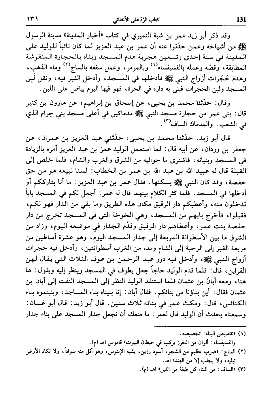 وقال: حدّثنا محمد بن يحيى، عن إسحاق بن إبراهيم، عن هارون بن كثير قال: بنى عمر من حجارة مسجد النبي صلى الله عليه وسلّم مدماكين في أعلى مسجد بني حرام الذي في الشعب. والمدماك الساف «3».