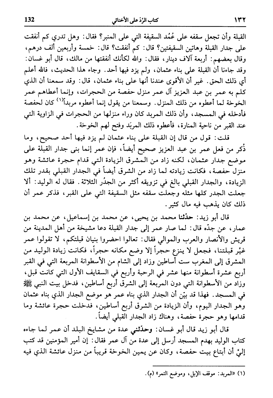 وقد جاءنا أن القبلة على بناء عثمان، ولم يزد فيها أحد. وجاء هذا الحديث، فالله أعلم أي ذلك الحق. غير أن الأقوى عندنا أنها على بناء عثمان، قال: وقد سمعنا أن الذي كلم به عمر بن عبد العزيز آل عمر منزل حفصة من الحجرات، وإنما أعطاهم عمر الخوخة لما أعطوه من ذلك المنزل. وسمعنا من يقول إنما أعطوه مربدا «1» كان لحفصة فأدخله في المسجد، وأن ذلك المربد كان وراء منزلها من الحجرات في الزاوية التي عند القبر من ناحية المنارة، فأعطوه ذلك المربد وفتح لهم الخوخة.
