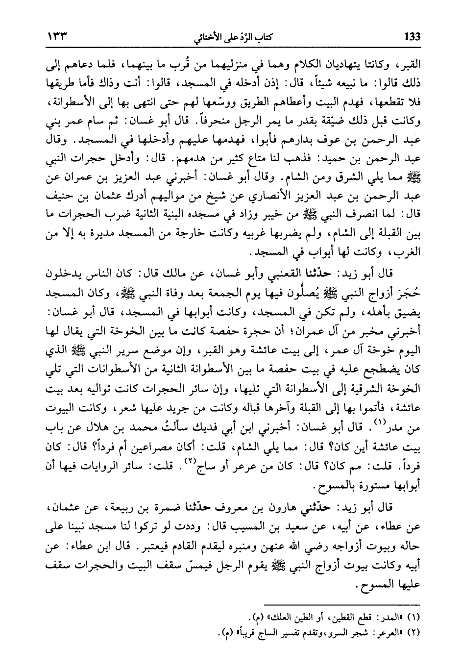 قال أبو زيد: حدّثنا القعنبي وأبو غسان، عن مالك قال: كان الناس يدخلون حجر أزواج النبي صلى الله عليه وسلّم يصلّون فيها يوم الجمعة بعد وفاة النبي صلى الله عليه وسلّم، وكان المسجد يضيق بأهله، ولم تكن في المسجد، وكانت أبوابها في المسجد، قال أبو غسان: