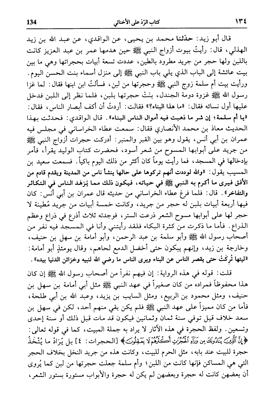 قال أبو زيد: حدّثنا محمد بن يحيى، عن الواقدي، عن عبد الله بن زيد الهذلي، قال: رأيت بيوت أزواج النبي صلى الله عليه وسلّم حين هدمها عمر بن عبد العزيز كانت باللبن ولها حجر من جريد مطرود بالطين، عددت تسعة أبيات بحجراتها وهي ما بين بيت عائشة إلى الباب الذي يلي باب النبي صلى الله عليه وسلّم إلى منزل أسماء بنت الحسن اليوم.
