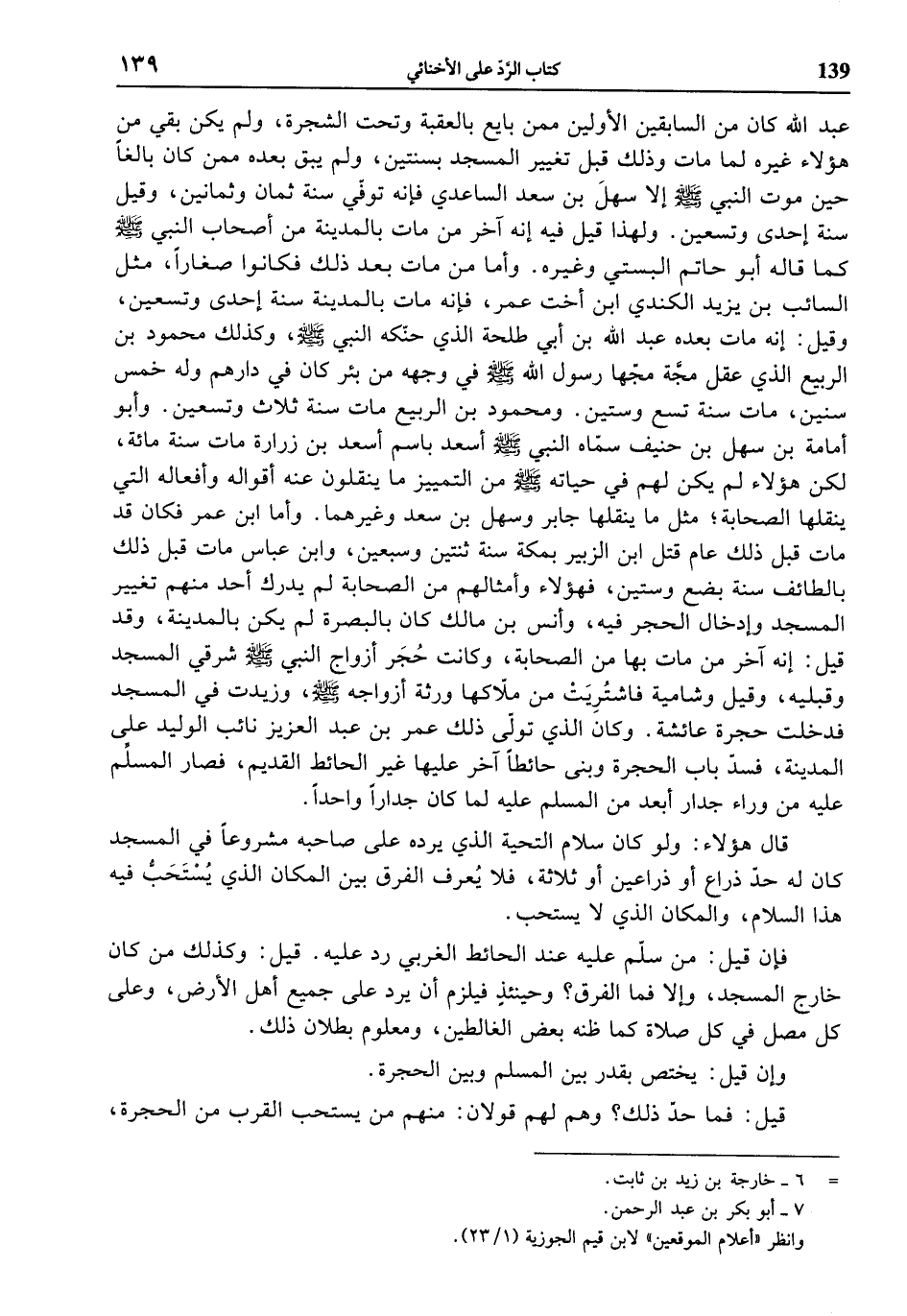 عبد الله كان من السابقين الأولين ممن بايع بالعقبة وتحت الشجرة، ولم يكن بقي من هؤلاء غيره لما مات وذلك قبل تغيير المسجد بسنتين، ولم يبق بعده ممن كان بالغا حين موت النبي صلى الله عليه وسلّم إلا سهل بن سعد الساعدي فإنه توفّي سنة ثمان وثمانين، وقيل سنة إحدى وتسعين. ولهذا قيل فيه إنه آخر من مات بالمدينة من أصحاب النبي صلى الله عليه وسلّم كما قاله أبو حاتم البستي وغيره. وأما من مات بعد ذلك فكانوا صغارا، مثل السائب بن يزيد الكندي ابن أخت عمر، فإنه مات بالمدينة سنة إحدى وتسعين، وقيل: إنه مات بعده عبد الله بن أبي طلحة الذي حنّكه النبي صلى الله عليه وسلّم، وكذلك محمود بن الربيع الذي عقل مجّة مجّها رسول الله صلى الله عليه وسلّم في وجهه من بئر كان في دارهم وله خمس سنين، مات سنة تسع وستين. ومحمود بن الربيع مات سنة ثلاث وتسعين. وأبو أمامة بن سهل بن حنيف سمّاه النبي صلى الله عليه وسلّم أسعد باسم أسعد بن زرارة مات سنة مائة، لكن هؤلاء لم يكن لهم في حياته صلى الله عليه وسلّم من التمييز ما ينقلون عنه أقواله وأفعاله التي ينقلها الصحابة؛ مثل ما ينقلها جابر وسهل بن سعد وغيرهما. وأما ابن عمر فكان قد مات قبل ذلك عام قتل ابن الزبير بمكة سنة ثنتين وسبعين، وابن عباس مات قبل ذلك بالطائف سنة بضع وستين، فهؤلاء وأمثالهم من الصحابة لم يدرك أحد منهم تغيير المسجد وإدخال الحجر فيه، وأنس بن مالك كان بالبصرة لم يكن بالمدينة، وقد قيل: إنه آخر من مات بها من الصحابة، وكانت حجر أزواج النبي صلى الله عليه وسلّم شرقي المسجد وقبليه، وقيل وشامية فاشتريت من ملّاكها ورثة أزواجه صلى الله عليه وسلّم، وزيدت في المسجد فدخلت حجرة عائشة. وكان الذي تولّى ذلك عمر بن عبد العزيز نائب الوليد على المدينة، فسدّ باب الحجرة وبنى حائطا آخر عليها غير الحائط القديم، فصار المسلّم عليه من وراء جدار أبعد من المسلم عليه لما كان جدارا واحدا.