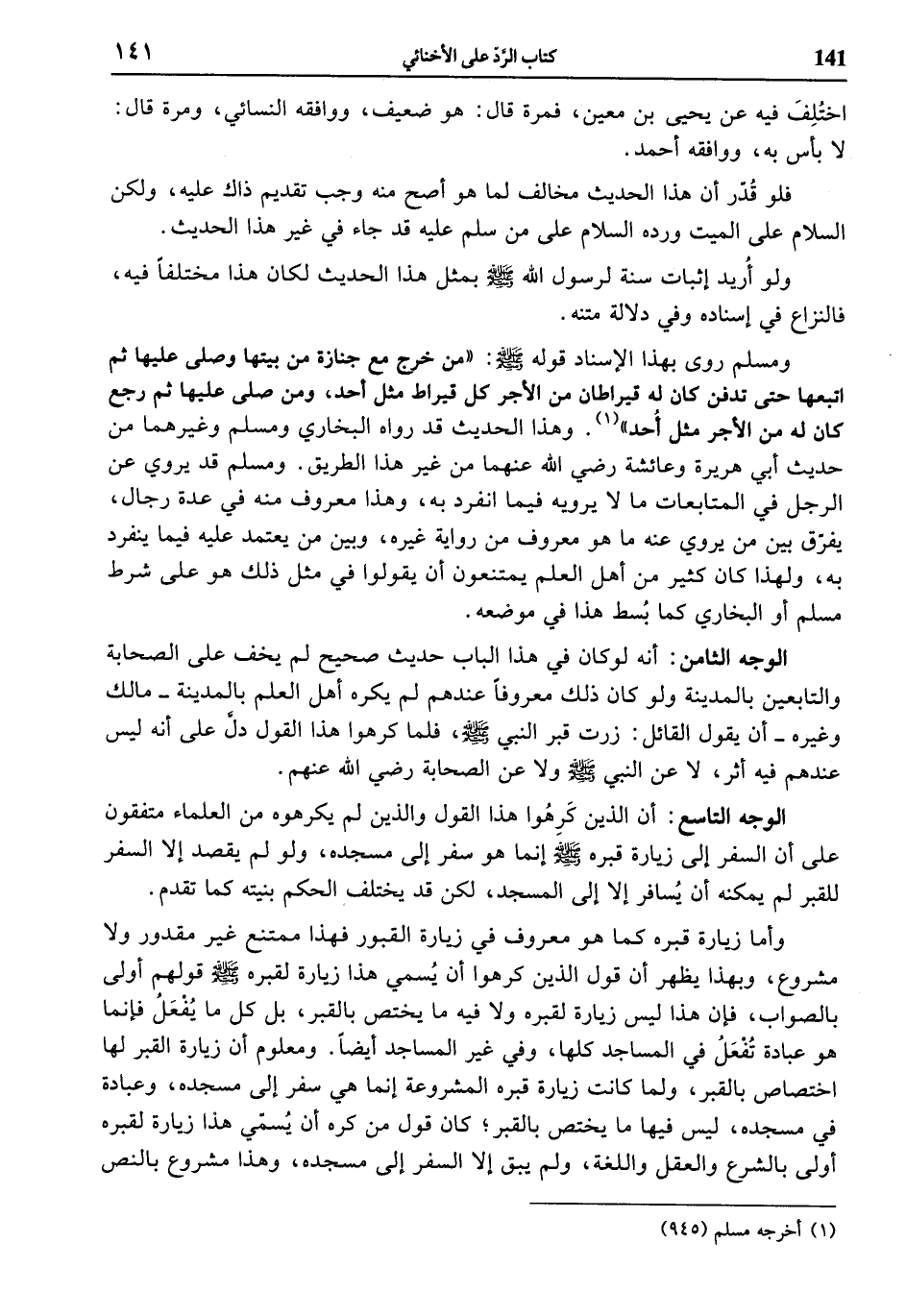 الوجه الثامن: أنه لو كان في هذا الباب حديث صحيح لم يخف على الصحابة والتابعين بالمدينة ولو كان ذلك معروفا عندهم لم يكره أهل العلم بالمدينة- مالك وغيره- أن يقول القائل: زرت قبر النبي صلى الله عليه وسلّم، فلما كرهوا هذا القول دلّ على أنه ليس عندهم فيه أثر، لا عن النبي صلى الله عليه وسلّم ولا عن الصحابة رضي الله عنهم.