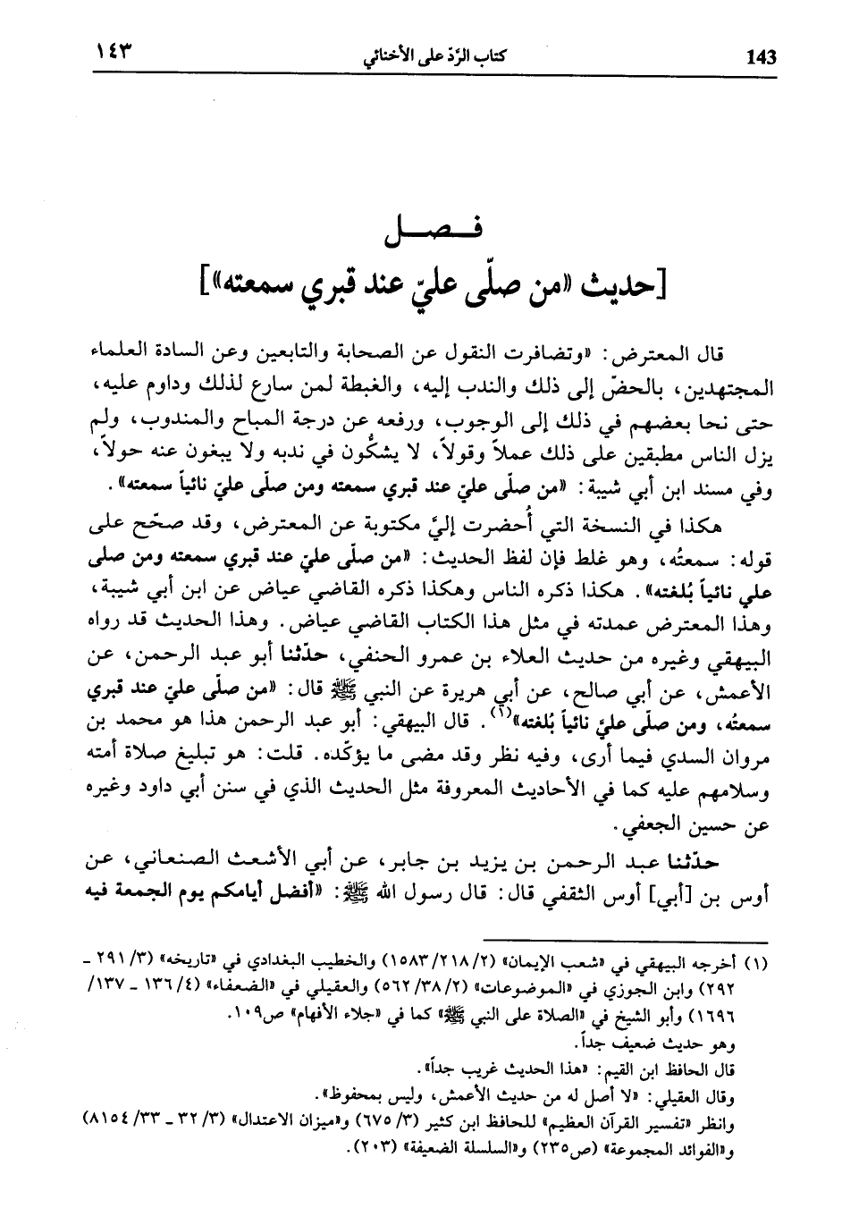 قال المعترض: «وتضافرت النقول عن الصحابة والتابعين وعن السادة العلماء المجتهدين، بالحضّ إلى ذلك والندب إليه، والغبطة لمن سارع لذلك وداوم عليه، حتى نحا بعضهم في ذلك إلى الوجوب، ورفعه عن درجة المباح والمندوب، ولم يزل الناس مطبقين على ذلك عملا وقولا، لا يشكّون في ندبه ولا يبغون عنه حولا، وفي مسند ابن أبي شيبة: «من صلّى عليّ عند قبري سمعته ومن صلّى عليّ نائيا سمعته».