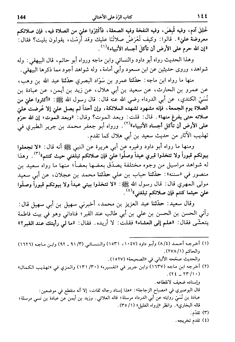ومنها ما رواه أبو داود وغيره عن أبي هريرة عن النبي صلى الله عليه وسلّم أنه قال: «لا تجعلوا بيوتكم قبورا ولا تتخذوا قبري عيدا وصلّوا عليّ فإن صلاتكم تبلغني حيث كنتم» «3». وهذا له شواهد مراسيل من وجوه مختلفة يصدّق بعضها بعضا؛ منها ما رواه سعيد بن منصور في «سننه»: حدّثنا حباب بن علي حدّثنا محمد بن عجلان، عن أبي سعيد مولى المهري قال: قال رسول الله صلى الله عليه وسلّم: «لا تتخذوا بيتي عيدا ولا بيوتكم قبورا وصلّوا عليّ حيثما كنتم فإن صلاتكم تبلغني» «4».