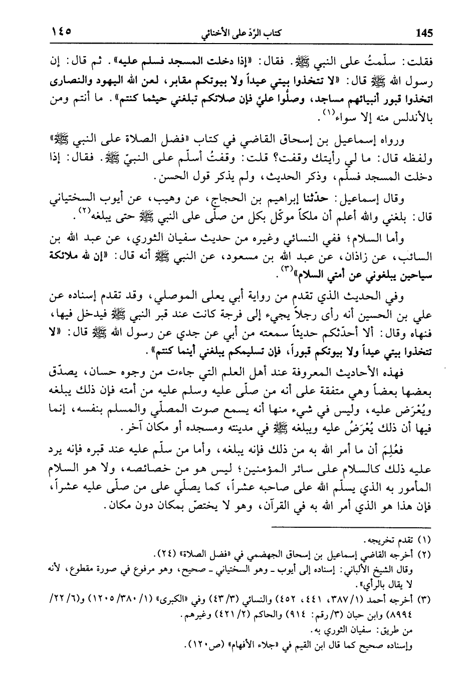 فهذه الأحاديث المعروفة عند أهل العلم التي جاءت من وجوه حسان، يصدّق بعضها بعضا وهي متفقة على أنه من صلّى عليه وسلم عليه من أمته فإن ذلك يبلغه ويعرض عليه، وليس في شيء منها أنه يسمع صوت المصلّي والمسلم بنفسه، إنما فيها أن ذلك يعرض عليه ويبلغه صلى الله عليه وسلّم في مدينته ومسجده أو مكان آخر.