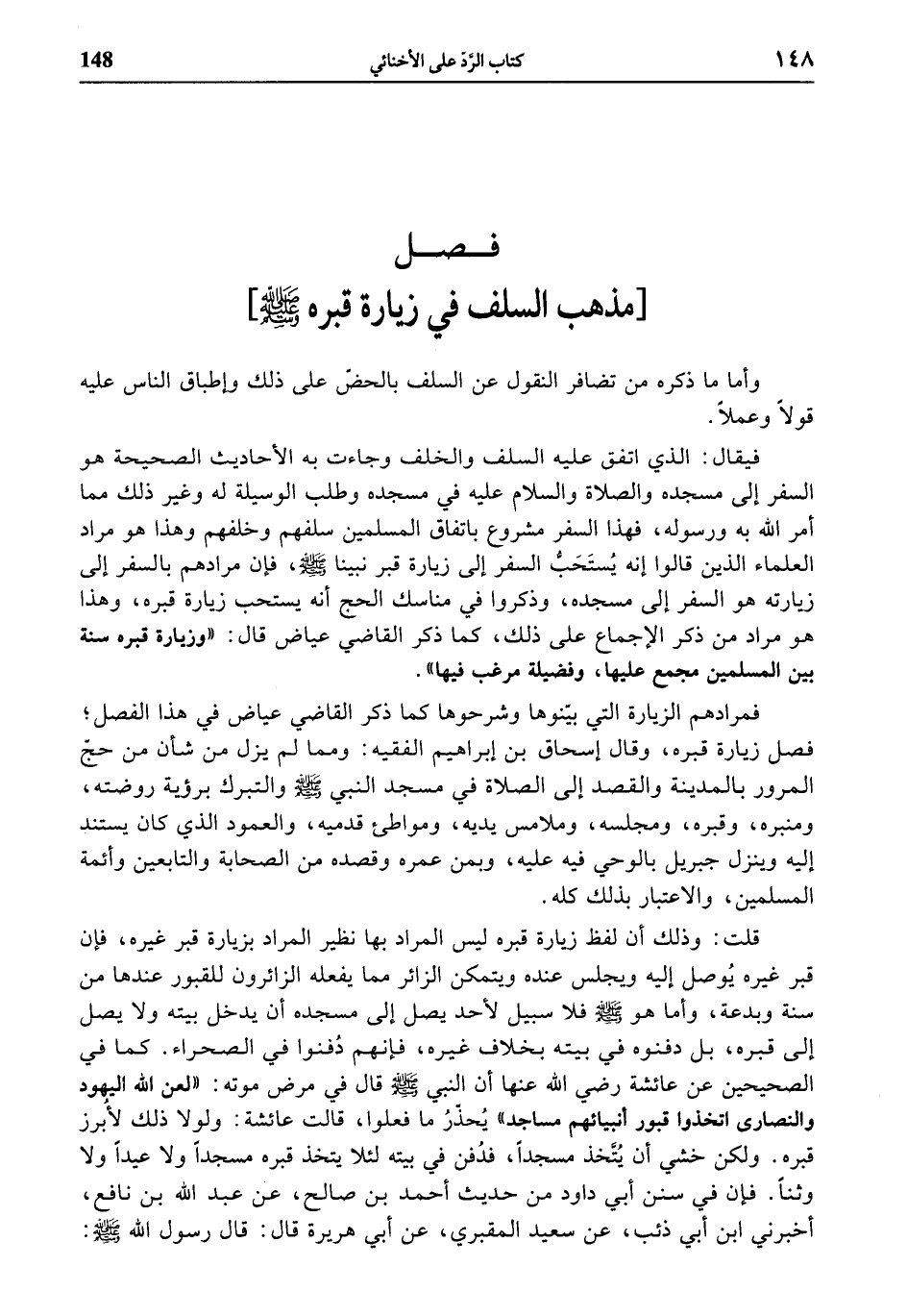 قلت: وذلك أن لفظ زيارة قبره ليس المراد بها نظير المراد بزيارة قبر غيره، فإن قبر غيره يوصل إليه ويجلس عنده ويتمكن الزائر مما يفعله الزائرون للقبور عندها من سنة وبدعة، وأما هو صلى الله عليه وسلّم فلا سبيل لأحد يصل إلى مسجده أن يدخل بيته ولا يصل إلى قبره، بل دفنوه في بيته بخلاف غيره، فإنهم دفنوا في الصحراء. كما في الصحيحين عن عائشة رضي الله عنها أن النبي صلى الله عليه وسلّم قال في مرض موته: «لعن الله اليهود والنصارى اتخذوا قبور أنبيائهم مساجد» يحذّر ما فعلوا، قالت عائشة: ولولا ذلك لأبرز قبره. ولكن خشي أن يتّخذ مسجدا، فدفن في بيته لئلا يتخذ قبره مسجدا ولا عيدا ولا وثنا. فإن في سنن أبي داود من حديث أحمد بن صالح، عن عبد الله بن نافع، أخبرني ابن أبي ذئب، عن سعيد المقبري، عن أبي هريرة قال: قال رسول الله صلى الله عليه وسلّم: