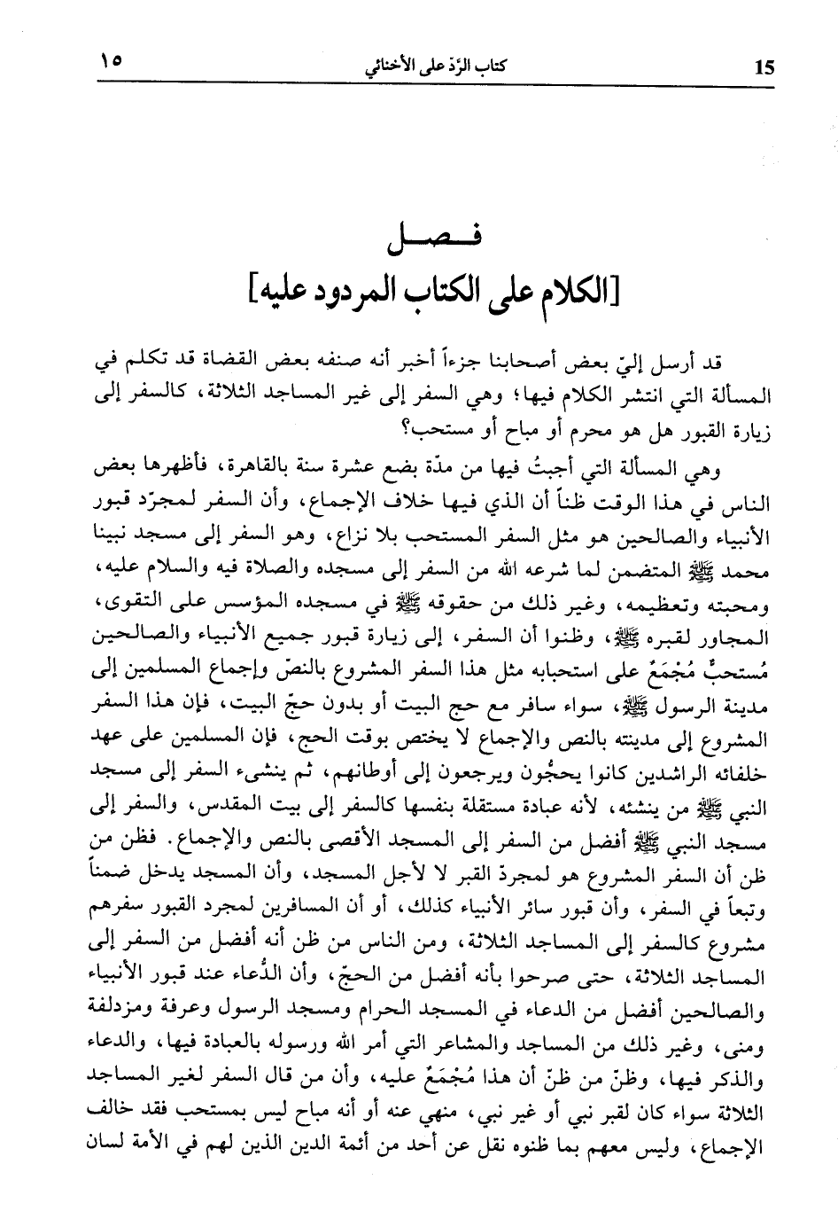 وهي المسألة التي أجبت فيها من مدّة بضع عشرة سنة بالقاهرة، فأظهرها بعض الناس في هذا الوقت ظنا أن الذي فيها خلاف الإجماع، وأن السفر لمجرّد قبور الأنبياء والصالحين هو مثل السفر المستحب بلا نزاع، وهو السفر إلى مسجد نبينا محمد صلى الله عليه وسلّم المتضمن لما شرعه الله من السفر إلى مسجده والصلاة فيه والسلام عليه، ومحبته وتعظيمه، وغير ذلك من حقوقه صلى الله عليه وسلّم في مسجده المؤسس على التقوى، المجاور لقبره صلى الله عليه وسلّم، وظنوا أن السفر، إلى زيارة قبور جميع الأنبياء والصالحين مستحبّ مجمع على استحبابه مثل هذا السفر المشروع بالنصّ وإجماع المسلمين إلى مدينة الرسول صلى الله عليه وسلّم، سواء سافر مع حج البيت أو بدون حجّ البيت، فإن هذا السفر المشروع إلى مدينته بالنص والإجماع لا يختص بوقت الحج، فإن المسلمين على عهد خلفائه الراشدين كانوا يحجّون ويرجعون إلى أوطانهم، ثم ينشئ السفر إلى مسجد النبي صلى الله عليه وسلّم من ينشئه، لأنه عبادة مستقلة بنفسها كالسفر إلى بيت المقدس، والسفر إلى مسجد النبي صلى الله عليه وسلّم أفضل من السفر إلى المسجد الأقصى بالنص والإجماع. فظن من ظن أن السفر المشروع هو لمجرّد القبر لا لأجل المسجد، وأن المسجد يدخل ضمنا وتبعا في السفر، وأن قبور سائر الأنبياء كذلك، أو أن المسافرين لمجرد القبور سفرهم مشروع كالسفر إلى المساجد الثلاثة، ومن الناس من ظن أنه أفضل من السفر إلى المساجد الثلاثة، حتى صرحوا بأنه أفضل من الحجّ، وأن الدّعاء عند قبور الأنبياء والصالحين أفضل من الدعاء في المسجد الحرام ومسجد الرسول وعرفة ومزدلفة ومنى، وغير ذلك من المساجد والمشاعر التي أمر الله ورسوله بالعبادة فيها، والدعاء والذكر فيها، وظنّ من ظنّ أن هذا مجمع عليه، وأن من قال السفر لغير المساجد الثلاثة سواء كان لقبر نبي أو غير نبي، منهي عنه أو أنه مباح ليس بمستحب فقد خالف الإجماع، وليس معهم بما ظنوه نقل عن أحد من أئمة الدين الذين لهم في الأمة لسان