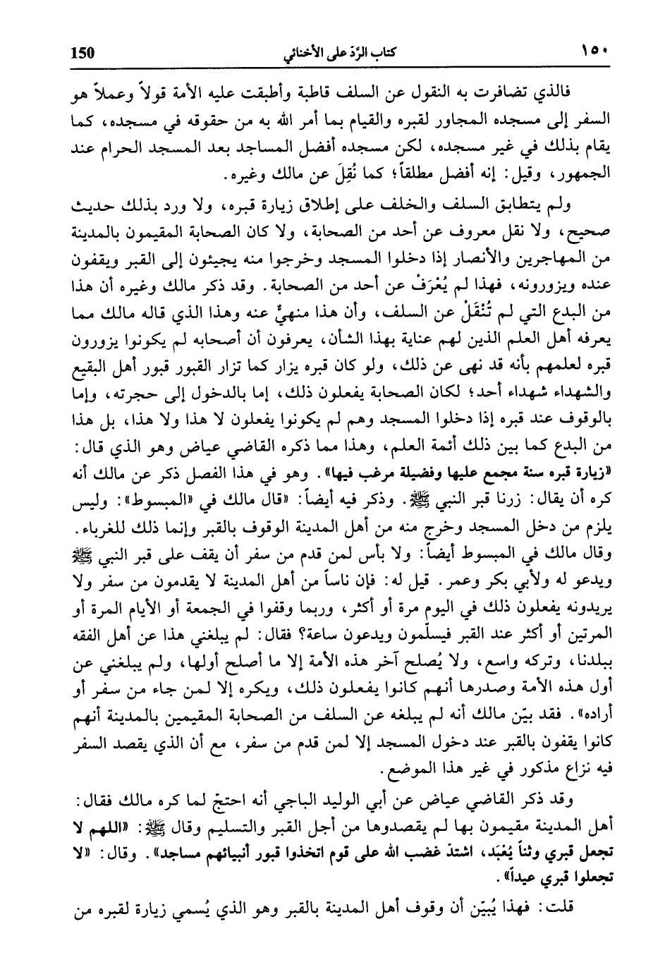 «زيارة قبره سنة مجمع عليها وفضيلة مرغب فيها». وهو في هذا الفصل ذكر عن مالك أنه كره أن يقال: زرنا قبر النبي صلى الله عليه وسلّم. وذكر فيه أيضا: «قال مالك في «المبسوط»: وليس يلزم من دخل المسجد وخرج منه من أهل المدينة الوقوف بالقبر وإنما ذلك للغرباء.