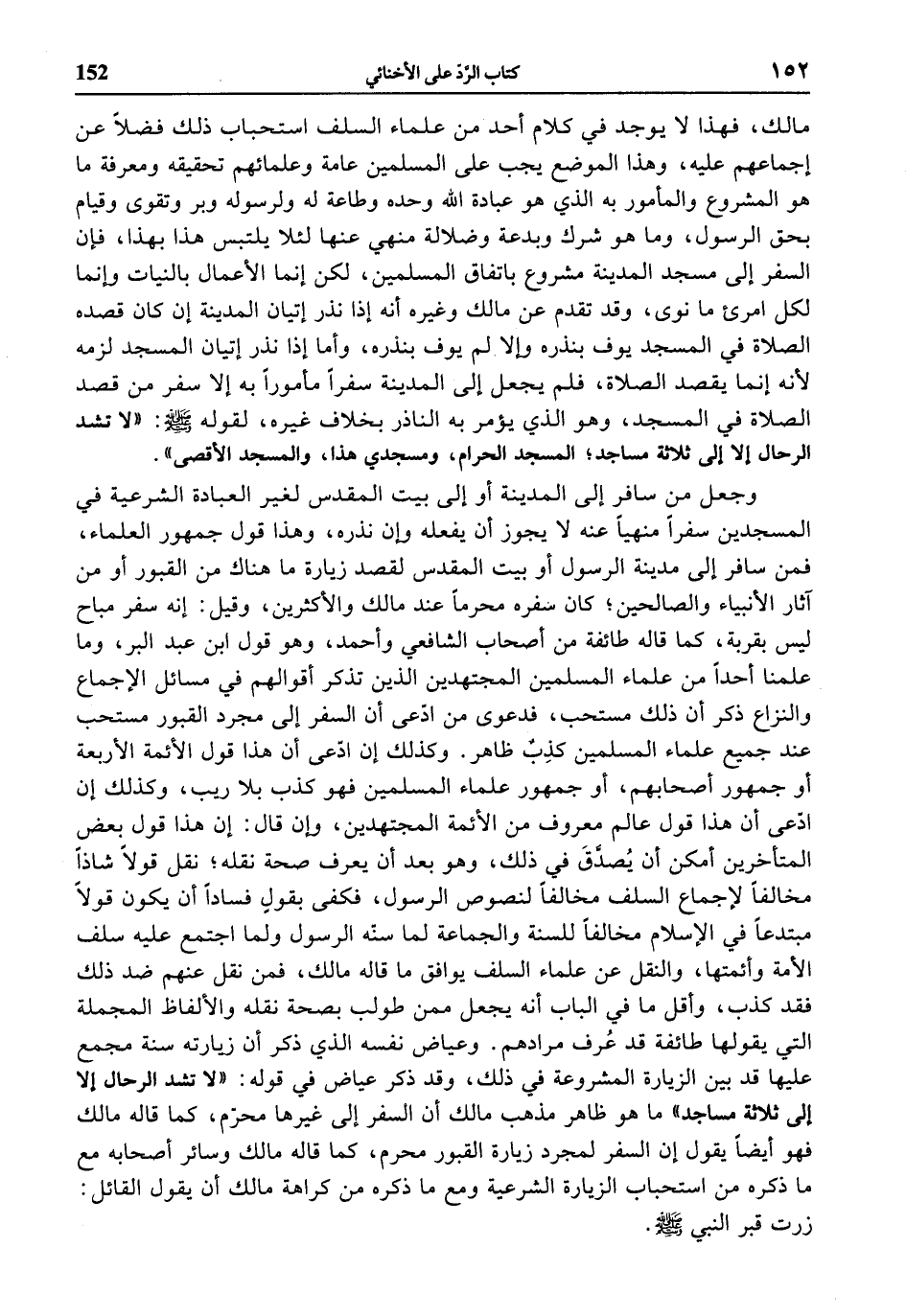 وجعل من سافر إلى المدينة أو إلى بيت المقدس لغير العبادة الشرعية في المسجدين سفرا منهيا عنه لا يجوز أن يفعله وإن نذره، وهذا قول جمهور العلماء، فمن سافر إلى مدينة الرسول أو بيت المقدس لقصد زيارة ما هناك من القبور أو من آثار الأنبياء والصالحين؛ كان سفره محرما عند مالك والأكثرين، وقيل: إنه سفر مباح ليس بقربة، كما قاله طائفة من أصحاب الشافعي وأحمد، وهو قول ابن عبد البر، وما علمنا أحدا من علماء المسلمين المجتهدين الذين تذكر أقوالهم في مسائل الإجماع والنزاع ذكر أن ذلك مستحب، فدعوى من ادّعى أن السفر إلى مجرد القبور مستحب عند جميع علماء المسلمين كذب ظاهر. وكذلك إن ادّعى أن هذا قول الأئمة الأربعة أو جمهور أصحابهم، أو جمهور علماء المسلمين فهو كذب بلا ريب، وكذلك إن ادّعى أن هذا قول عالم معروف من الأئمة المجتهدين، وإن قال: إن هذا قول بعض المتأخرين أمكن أن يصدّق في ذلك، وهو بعد أن يعرف صحة نقله؛ نقل قولا شاذا مخالفا لإجماع السلف مخالفا لنصوص الرسول، فكفى بقول فسادا أن يكون قولا مبتدعا في الإسلام مخالفا للسنة والجماعة لما سنّه الرسول ولما اجتمع عليه سلف الأمة وأئمتها، والنقل عن علماء السلف يوافق ما قاله مالك، فمن نقل عنهم ضد ذلك فقد كذب، وأقل ما في الباب أنه يجعل ممن طولب بصحة نقله والألفاظ المجملة التي يقولها طائفة قد عرف مرادهم. وعياض نفسه الذي ذكر أن زيارته سنة مجمع عليها قد بين الزيارة المشروعة في ذلك، وقد ذكر عياض في قوله: «لا تشد الرحال إلا إلى ثلاثة مساجد» ما هو ظاهر مذهب مالك أن السفر إلى غيرها محرّم، كما قاله مالك فهو أيضا يقول إن السفر لمجرد زيارة القبور محرم، كما قاله مالك وسائر أصحابه مع ما ذكره من استحباب الزيارة الشرعية ومع ما ذكره من كراهة مالك أن يقول القائل: