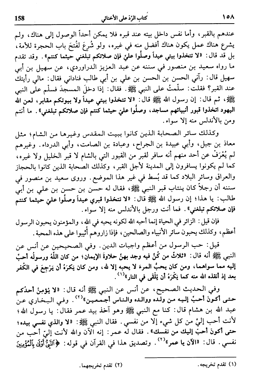 وكذلك سائر الصحابة الذين كانوا ببيت المقدس وغيرها من الشام؛ مثل معاذ بن جبل، وأبي عبيدة بن الجراح، وعبادة بن الصامت، وأبي الدرداء. وغيرهم لم يعرف عن أحد منهم أنه سافر لقبر من القبور التي بالشام لا قبر الخليل ولا غيره، كما لم يكونوا يسافرون إلى المدينة لأجل القبر، وكذلك الصحابة الذين كانوا بالحجاز والعراق وسائر البلاد كما قد بسط في غير هذا الموضع. وروى سعيد بن منصور في سننه أن رجلا كان ينتاب قبر النبي صلى الله عليه وسلّم، فقال له حسن بن حسن بن علي بن أبي طالب: يا هذا؛ إن رسول الله صلى الله عليه وسلّم قال: «لا تتخذوا قبري عيدا وصلّوا عليّ حيثما كنتم فإن صلاتكم تبلغني». فما أنت ورجل بالأندلس منه إلا سواء.