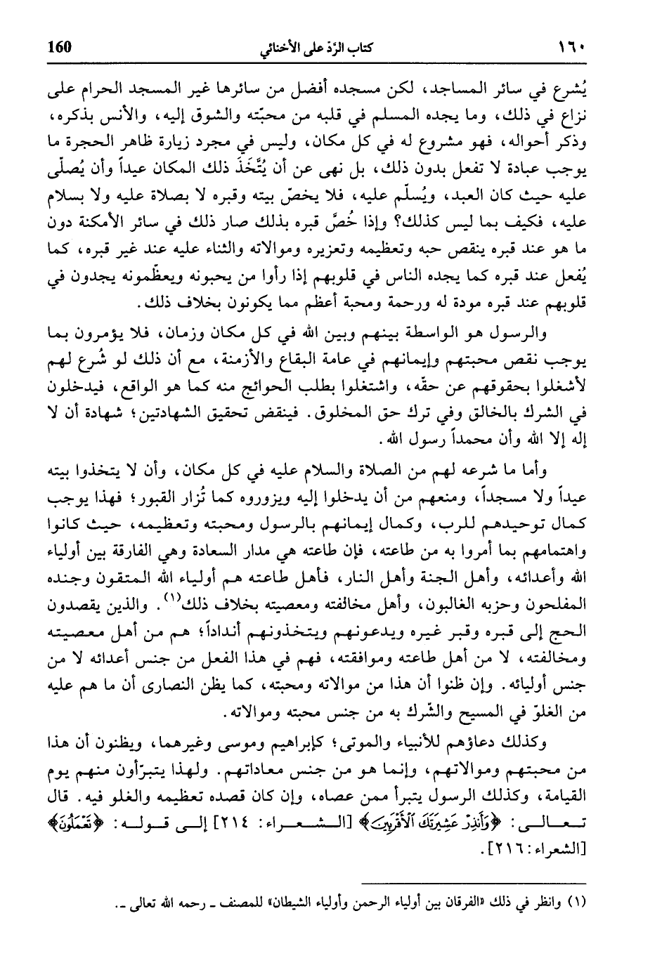 وأما ما شرعه لهم من الصلاة والسلام عليه في كل مكان، وأن لا يتخذوا بيته عيدا ولا مسجدا، ومنعهم من أن يدخلوا إليه ويزوروه كما تزار القبور؛ فهذا يوجب كمال توحيدهم للرب، وكمال إيمانهم بالرسول ومحبته وتعظيمه، حيث كانوا واهتمامهم بما أمروا به من طاعته، فإن طاعته هي مدار السعادة وهي الفارقة بين أولياء الله وأعدائه، وأهل الجنة وأهل النار، فأهل طاعته هم أولياء الله المتقون وجنده المفلحون وحزبه الغالبون، وأهل مخالفته ومعصيته بخلاف ذلك «1». والذين يقصدون الحج إلى قبره وقبر غيره ويدعونهم ويتخذونهم أندادا؛ هم من أهل معصيته ومخالفته، لا من أهل طاعته وموافقته، فهم في هذا الفعل من جنس أعدائه لا من جنس أوليائه. وإن ظنوا أن هذا من موالاته ومحبته، كما يظن النصارى أن ما هم عليه من الغلوّ في المسيح والشّرك به من جنس محبته وموالاته.