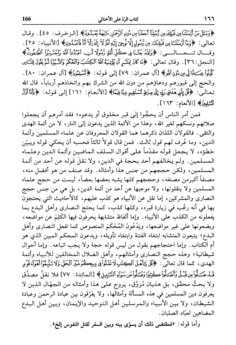 فمن أمر الناس أن يحجّوا إلى قبر مخلوق أو يدعوه؛ فقد أمرهم أن يجعلوا صلاتهم ونسكهم لغير الله، وهذا من الأئمة الذين يدعون إلى النار، لا من أئمة الهدى والتقى. فالقولان اللذان ذكرهما هما القولان المعروفان عن علماء المسلمين وأئمة الدين، وما عرف لهم قول ثالث. فمن قال قولا ثالثا فحسبه أن يحكي قوله ويبيّن خطؤه، لا يجعل قوله مقدّما على أقوال السلف الماضين وأئمة الدين وعلماء المسلمين. ولم يخالفهم أحد بحجة في الدين، ولا نقل قوله عن أحد من أئمة المسلمين، ولكن حججهم من جنس هذا وأمثاله. وقد صنف من هو أفضل منه، مصنفا أكبر من مصنفه، وحججهم كلها يشبه بعضها بعضا، ليست من حجج علماء المسلمين ولا ينقلونها، ولا موجبها عن أحد من أئمة الدين، بل هي من جنس حجج النصارى والمشركين، إما نقل عن الأنبياء هو كذب عليهم، كالأحاديث التي يحتجون بها في أنه رغّب في زيارة قبره، وكلها كذب، كما يحتج النصارى وأهل البدع بما يفعلونه من الكذب على الأنبياء. وإما ألفاظ متشابهة يحرفون فيها الكلم عن مواضعه، ويضعونها على غير مواضعها، ويدعون المحكم المنصوص كما تفعل النصارى وأهل البدع؛ يتبعون المتشابه ابتغاء الفتنة وابتغاء تأويله، ويدعون المحكم المبين الذي هو أم الكتاب. وإما احتجاجهم بقول من ليس قوله حجة ولا يجب اتباعه. وإما أحوال شيطانية؛ وهذه حجج النصارى وأمثالهم، وأهل الضلال المخالفين للأنبياء وأئمة الهدى، كما قال تعالى: قُلْ يا أَهْلَ الْكِتابِ لا تَغْلُوا فِي دِينِكُمْ غَيْرَ الْحَقِّ وَلا تَتَّبِعُوا أَهْواءَ قَوْمٍ قَدْ ضَلُّوا مِنْ قَبْلُ وَأَضَلُّوا كَثِيراً وَضَلُّوا عَنْ سَواءِ السَّبِيلِ [المائدة: 77] فلا نقل مصدّق ولا بحث محقّق، بل هذيان مزوّق، يروج على هذا وأمثاله من الجهّال الذين لا يعرفون دين المسلمين في هذه المسألة وأمثالها، ولا يفرّقون بين عبادة الرحمن وعبادة الشيطان، ولا بين الأنبياء والمرسلين أهل التوحيد والإيمان، وبين أهل البدع المضاهين لعبّاد الصلبان.