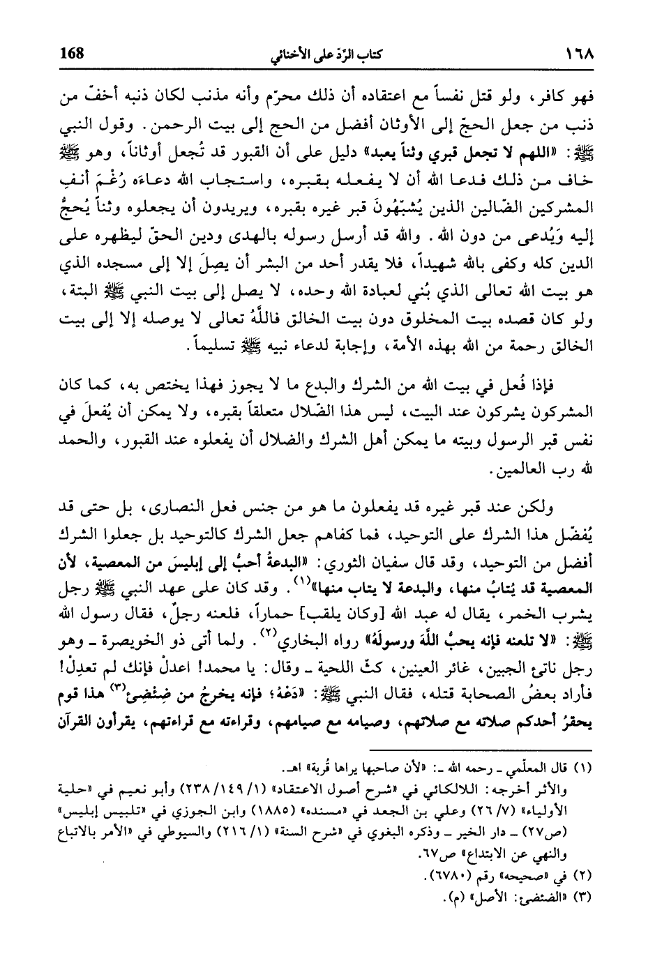 فهو كافر، ولو قتل نفسا مع اعتقاده أن ذلك محرّم وأنه مذنب لكان ذنبه أخفّ من ذنب من جعل الحجّ إلى الأوثان أفضل من الحج إلى بيت الرحمن. وقول النبي صلى الله عليه وسلّم: «اللهم لا تجعل قبري وثنا يعبد» دليل على أن القبور قد تجعل أوثانا، وهو صلى الله عليه وسلّم خاف من ذلك فدعا الله أن لا يفعله بقبره، واستجاب الله دعاءه رغم أنف المشركين الضّالين الذين يشبّهون قبر غيره بقبره، ويريدون أن يجعلوه وثنا يحجّ إليه ويدعى من دون الله. والله قد أرسل رسوله بالهدى ودين الحقّ ليظهره على الدين كله وكفى بالله شهيدا، فلا يقدر أحد من البشر أن يصل إلا إلى مسجده الذي هو بيت الله تعالى الذي بني لعبادة الله وحده، لا يصل إلى بيت النبي صلى الله عليه وسلّم البتة، ولو كان قصده بيت المخلوق دون بيت الخالق فالله تعالى لا يوصله إلا إلى بيت الخالق رحمة من الله بهذه الأمة، وإجابة لدعاء نبيه صلى الله عليه وسلّم تسليما.