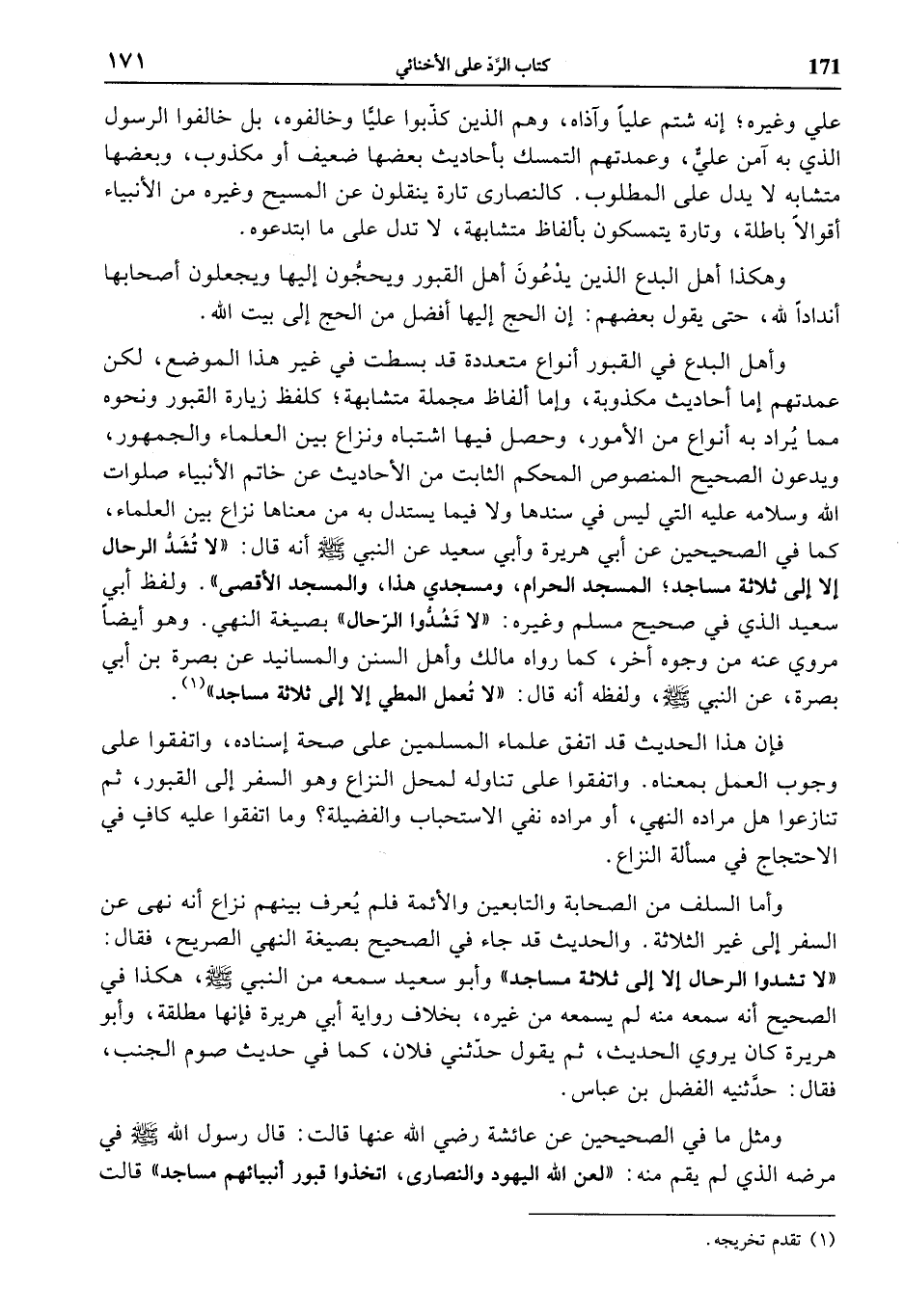 فإن هذا الحديث قد اتفق علماء المسلمين على صحة إسناده، واتفقوا على وجوب العمل بمعناه. واتفقوا على تناوله لمحل النزاع وهو السفر إلى القبور، ثم تنازعوا هل مراده النهي، أو مراده نفي الاستحباب والفضيلة؟ وما اتفقوا عليه كاف في الاحتجاج في مسألة النزاع.