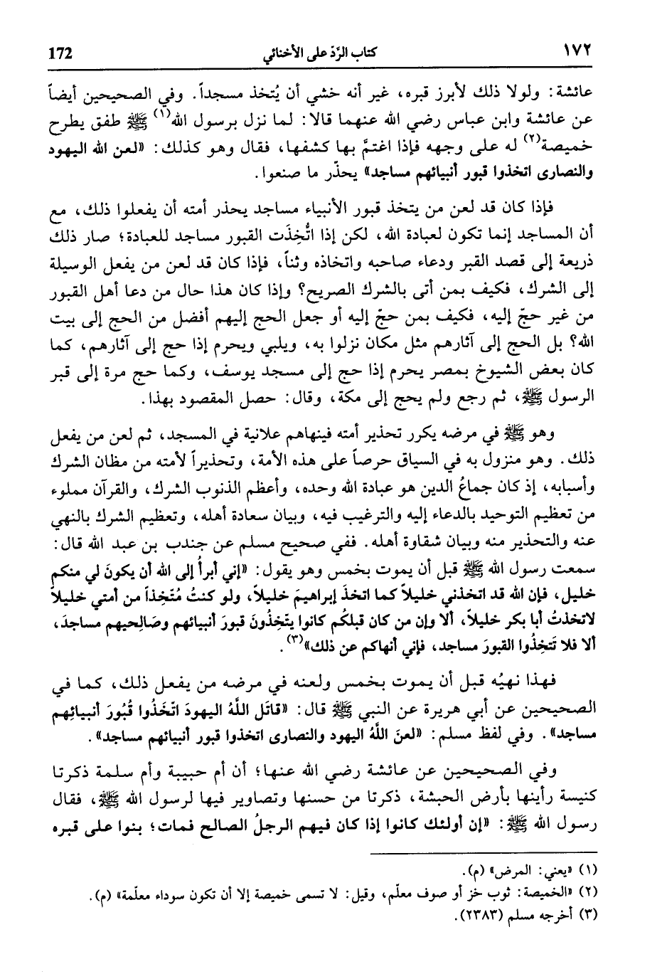 فهذا نهيه قبل أن يموت بخمس ولعنه في مرضه من يفعل ذلك، كما في الصحيحين عن أبي هريرة عن النبي صلى الله عليه وسلّم قال: «قاتل الله اليهود اتّخذوا قبور أنبيائهم مساجد». وفي لفظ مسلم: «لعن الله اليهود والنصارى اتخذوا قبور أنبيائهم مساجد».