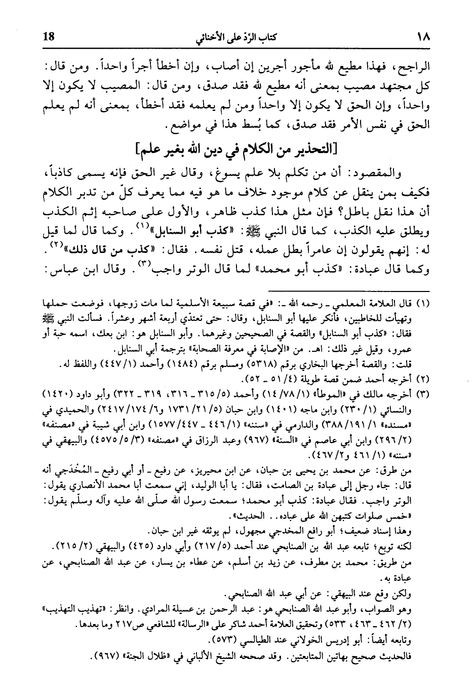 (1) قال العلامة المعلمي- رحمه الله-: «في قصة سبيعة الأسلمية لما مات زوجها، فوضعت حملها وتهيأت للخاطبين، فأنكر عليها أبو السنابل، وقال: حتى تعتدّي أربعة أشهر وعشرا. فسألت النبي صلى الله عليه وسلّم فقال: «كذب أبو السنابل» والقصة في الصحيحين وغيرهما. وأبو السنابل هو: ابن بعك، اسمه حبة أو عمرو، وقيل غير ذلك: اه. من «الإصابة في معرفة الصحابة» بترجمة أبي السنابل.