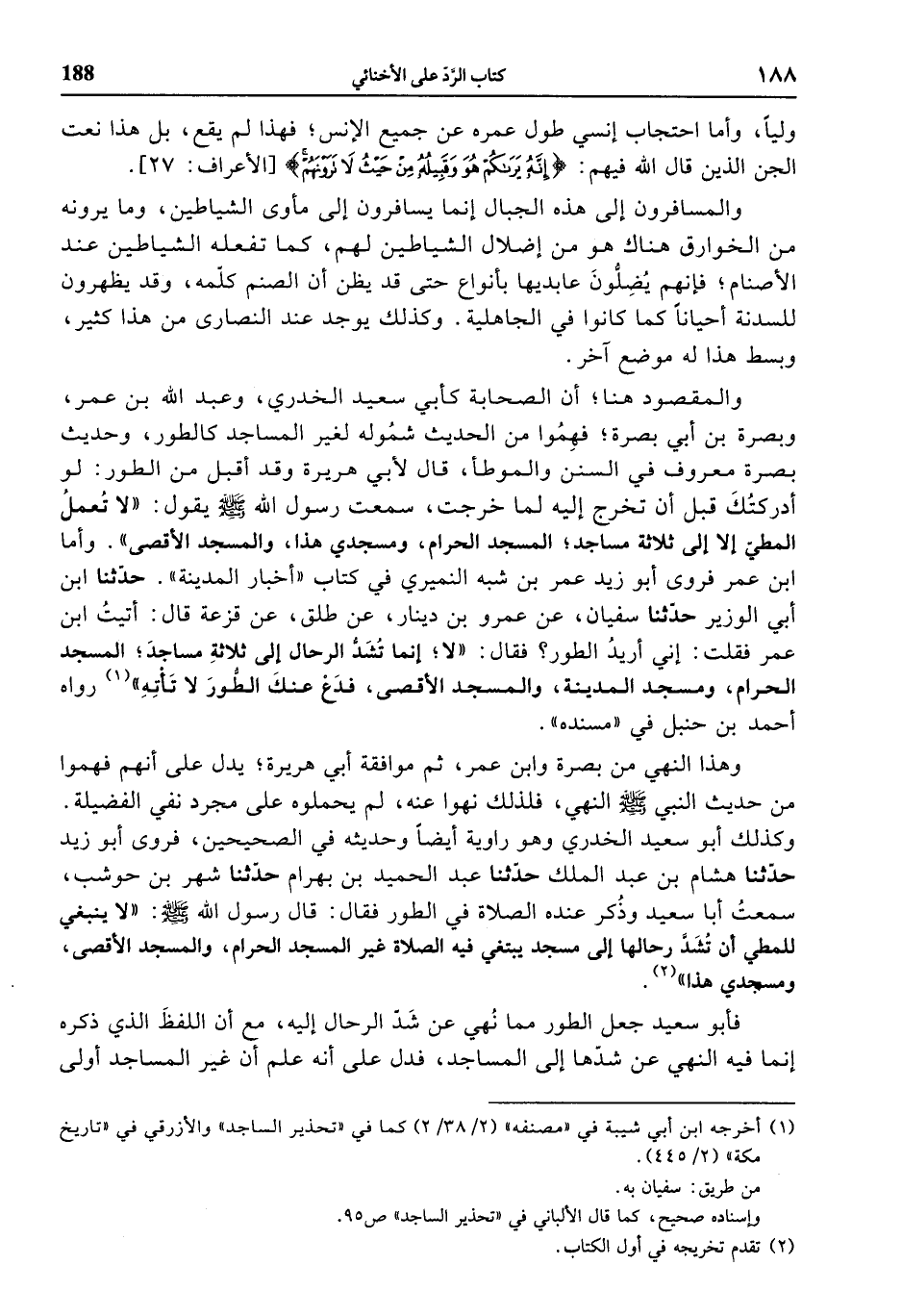 والمقصود هنا؛ أن الصحابة كأبي سعيد الخدري، وعبد الله بن عمر، وبصرة بن أبي بصرة؛ فهموا من الحديث شموله لغير المساجد كالطور، وحديث بصرة معروف في السنن والموطأ، قال لأبي هريرة وقد أقبل من الطور: لو أدركتك قبل أن تخرج إليه لما خرجت، سمعت رسول الله صلى الله عليه وسلّم يقول: «لا تعمل المطيّ إلا إلى ثلاثة مساجد؛ المسجد الحرام، ومسجدي هذا، والمسجد الأقصى». وأما ابن عمر فروى أبو زيد عمر بن شبه النميري في كتاب «أخبار المدينة». حدّثنا ابن أبي الوزير حدّثنا سفيان، عن عمرو بن دينار، عن طلق، عن قزعة قال: أتيت ابن عمر فقلت: إني أريد الطور؟ فقال: «لا؛ إنما تشدّ الرحال إلى ثلاثة مساجد؛ المسجد الحرام، ومسجد المدينة، والمسجد الأقصى، فدع عنك الطّور لا تأته» «1» رواه أحمد بن حنبل في «مسنده».