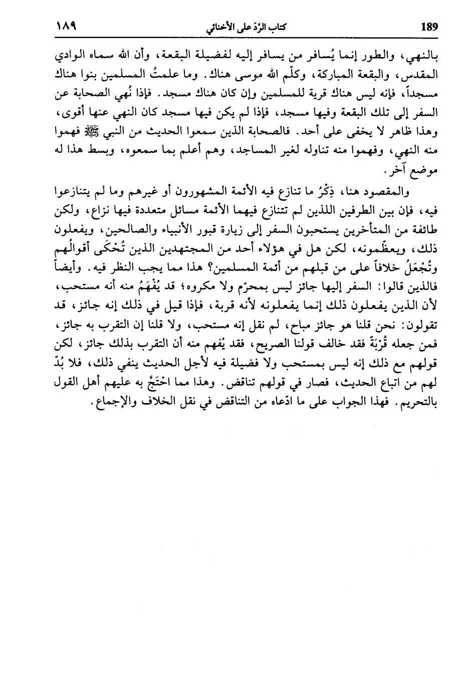 والمقصود هنا، ذكر ما تنازع فيه الأئمة المشهورون أو غيرهم وما لم يتنازعوا فيه، فإن بين الطرفين اللذين لم تتنازع فيهما الأئمة مسائل متعددة فيها نزاع، ولكن طائفة من المتأخرين يستحبون السفر إلى زيارة قبور الأنبياء والصالحين، ويفعلون ذلك، ويعظّمونه، لكن هل في هؤلاء أحد من المجتهدين الذين تحكى أقوالهم وتجعل خلافا على من قبلهم من أئمة المسلمين؟ هذا مما يجب النظر فيه. وأيضا فالذين قالوا: السفر إليها جائز ليس بمحرّم ولا مكروه؛ قد يفهم منه أنه مستحب، لأن الذين يفعلون ذلك إنما يفعلونه لأنه قربة، فإذا قيل في ذلك إنه جائز، قد تقولون: نحن قلنا هو جائز مباح، لم نقل إنه مستحب، ولا قلنا إن التقرب به جائز، فمن جعله قربة فقد خالف قولنا الصريح، فقد يفهم منه أن التقرب بذلك جائز، لكن قولهم مع ذلك إنه ليس بمستحب ولا فضيلة فيه لأجل الحديث ينفي ذلك، فلا بدّ لهم من اتباع الحديث، فصار في قولهم تناقض. وهذا مما احتجّ به عليهم أهل القول بالتحريم. فهذا الجواب على ما ادّعاه من التناقض في نقل الخلاف والإجماع.