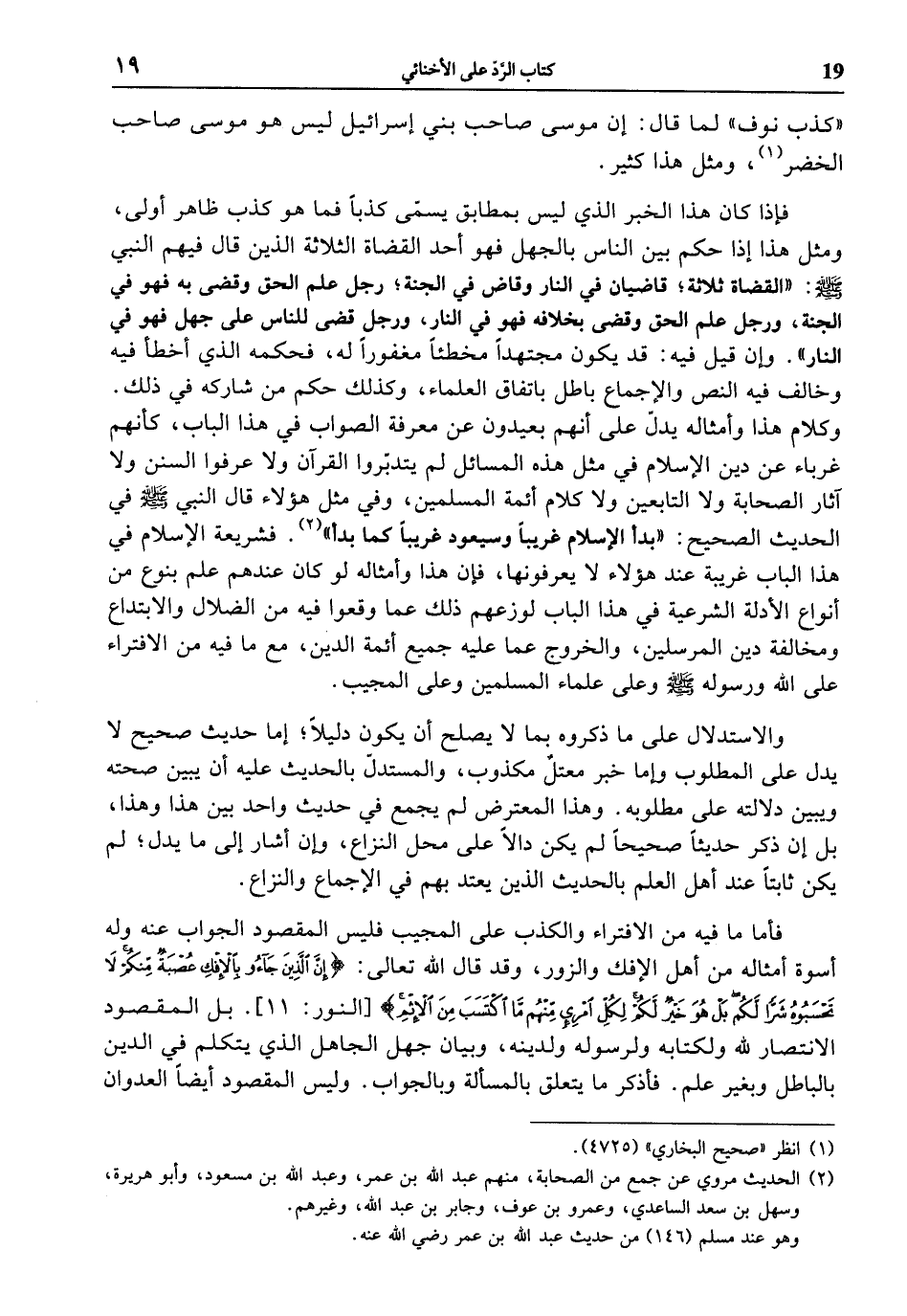 فإذا كان هذا الخبر الذي ليس بمطابق يسمّى كذبا فما هو كذب ظاهر أولى، ومثل هذا إذا حكم بين الناس بالجهل فهو أحد القضاة الثلاثة الذين قال فيهم النبي صلى الله عليه وسلّم: «القضاة ثلاثة؛ قاضيان في النار وقاض في الجنة؛ رجل علم الحق وقضى به فهو في الجنة، ورجل علم الحق وقضى بخلافه فهو في النار، ورجل قضى للناس على جهل فهو في النار». وإن قيل فيه: قد يكون مجتهدا مخطئا مغفورا له، فحكمه الذي أخطأ فيه وخالف فيه النص والإجماع باطل باتفاق العلماء، وكذلك حكم من شاركه في ذلك.