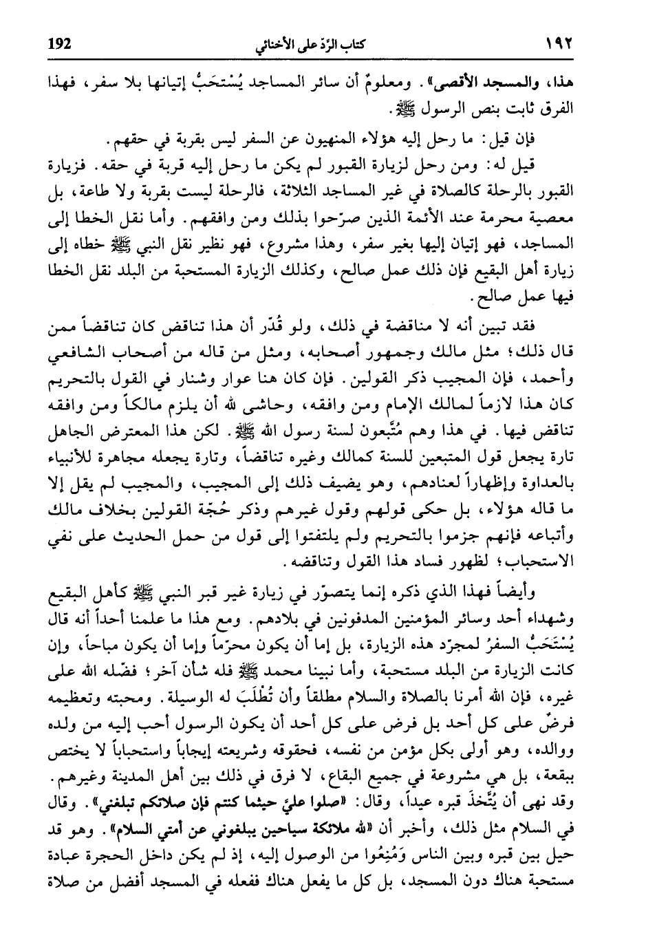 قيل له: ومن رحل لزيارة القبور لم يكن ما رحل إليه قربة في حقه. فزيارة القبور بالرحلة كالصلاة في غير المساجد الثلاثة، فالرحلة ليست بقربة ولا طاعة، بل معصية محرمة عند الأئمة الذين صرّحوا بذلك ومن وافقهم. وأما نقل الخطا إلى المساجد، فهو إتيان إليها بغير سفر، وهذا مشروع، فهو نظير نقل النبي صلى الله عليه وسلّم خطاه إلى زيارة أهل البقيع فإن ذلك عمل صالح، وكذلك الزيارة المستحبة من البلد نقل الخطا فيها عمل صالح.