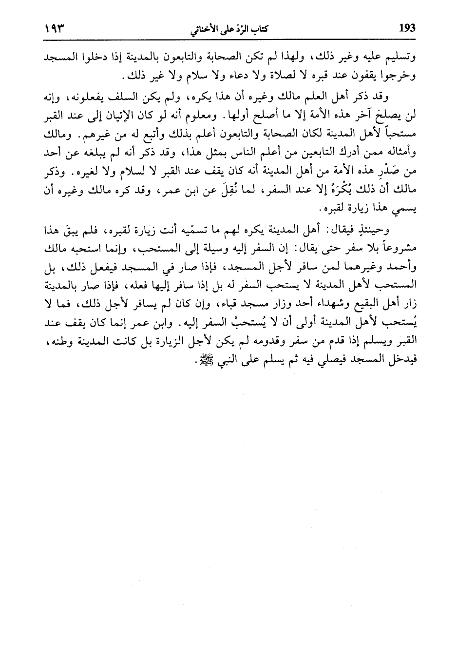 وحينئذ فيقال: أهل المدينة يكره لهم ما تسمّيه أنت زيارة لقبره، فلم يبق هذا مشروعا بلا سفر حتى يقال: إن السفر إليه وسيلة إلى المستحب، وإنما استحبه مالك وأحمد وغيرهما لمن سافر لأجل المسجد، فإذا صار في المسجد فيفعل ذلك، بل المستحب لأهل المدينة لا يستحب السفر له بل إذا سافر إليها فعله، فإذا صار بالمدينة زار أهل البقيع وشهداء أحد وزار مسجد قباء، وإن كان لم يسافر لأجل ذلك، فما لا يستحب لأهل المدينة أولى أن لا يستحبّ السفر إليه. وابن عمر إنما كان يقف عند القبر ويسلم إذا قدم من سفر وقدومه لم يكن لأجل الزيارة بل كانت المدينة وطنه، فيدخل المسجد فيصلي فيه ثم يسلم على النبي صلى الله عليه وسلّم.