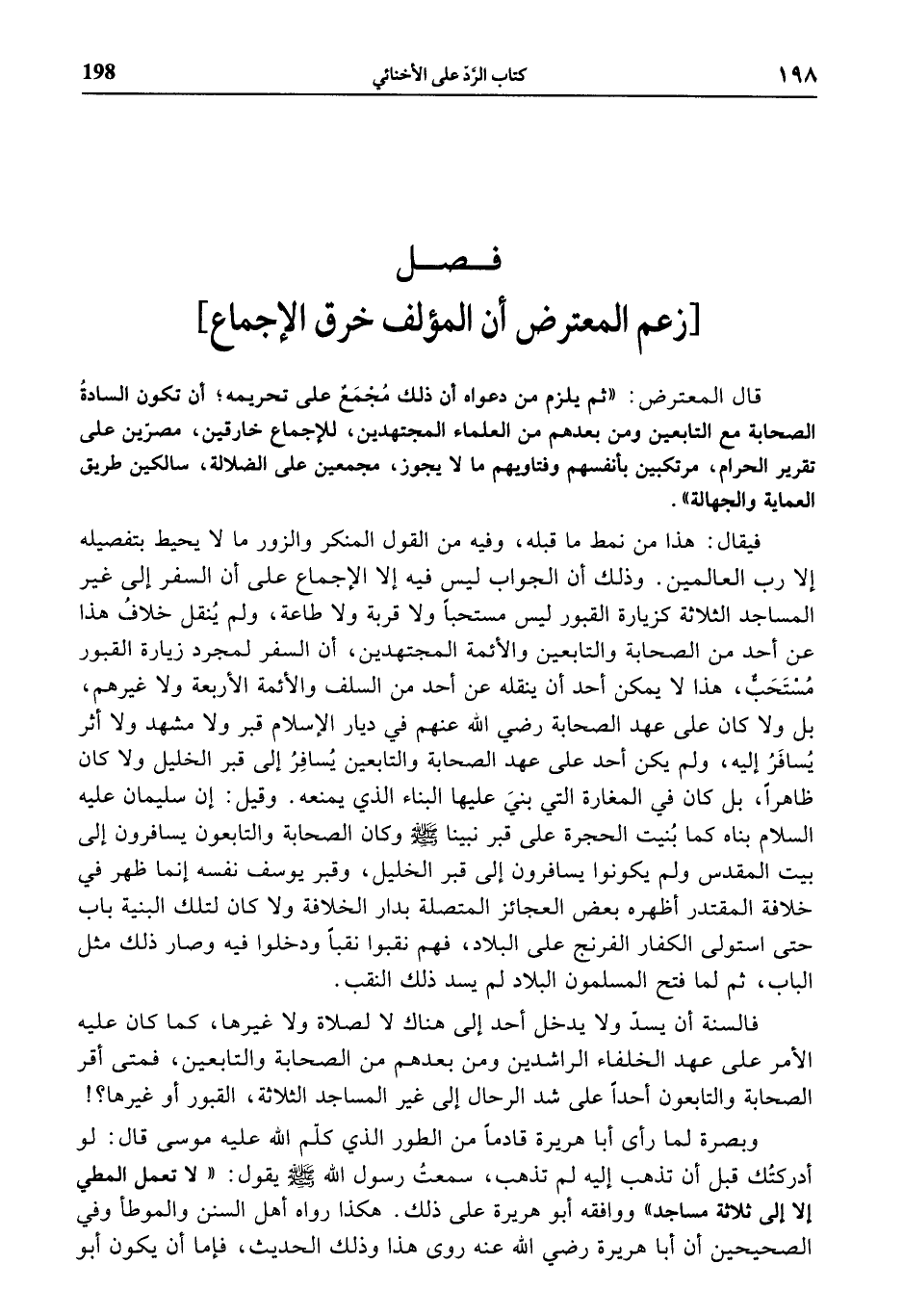فيقال: هذا من نمط ما قبله، وفيه من القول المنكر والزور ما لا يحيط بتفصيله إلا رب العالمين. وذلك أن الجواب ليس فيه إلا الإجماع على أن السفر إلى غير المساجد الثلاثة كزيارة القبور ليس مستحبا ولا قربة ولا طاعة، ولم ينقل خلاف هذا عن أحد من الصحابة والتابعين والأئمة المجتهدين، أن السفر لمجرد زيارة القبور مستحبّ، هذا لا يمكن أحد أن ينقله عن أحد من السلف والأئمة الأربعة ولا غيرهم، بل ولا كان على عهد الصحابة رضي الله عنهم في ديار الإسلام قبر ولا مشهد ولا أثر يسافر إليه، ولم يكن أحد على عهد الصحابة والتابعين يسافر إلى قبر الخليل ولا كان ظاهرا، بل كان في المغارة التي بني عليها البناء الذي يمنعه. وقيل: إن سليمان عليه السلام بناه كما بنيت الحجرة على قبر نبينا صلى الله عليه وسلّم وكان الصحابة والتابعون يسافرون إلى بيت المقدس ولم يكونوا يسافرون إلى قبر الخليل، وقبر يوسف نفسه إنما ظهر في خلافة المقتدر أظهره بعض العجائز المتصلة بدار الخلافة ولا كان لتلك البنية باب حتى استولى الكفار الفرنج على البلاد، فهم نقبوا نقبا ودخلوا فيه وصار ذلك مثل الباب، ثم لما فتح المسلمون البلاد لم يسد ذلك النقب.