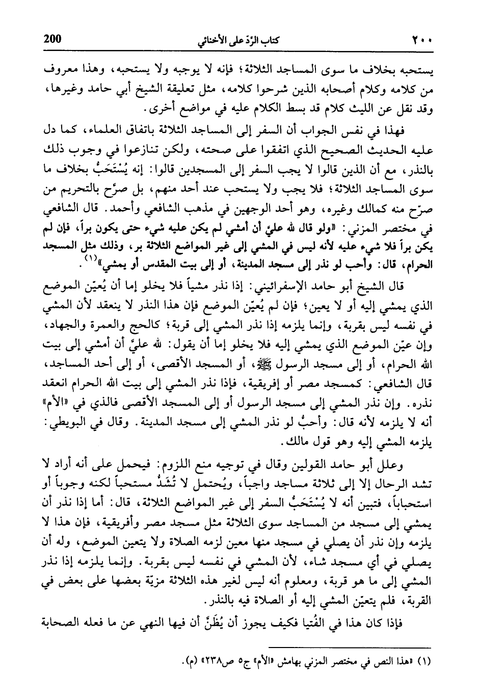 فهذا في نفس الجواب أن السفر إلى المساجد الثلاثة باتفاق العلماء، كما دل عليه الحديث الصحيح الذي اتفقوا على صحته، ولكن تنازعوا في وجوب ذلك بالنذر، مع أن الذين قالوا لا يجب السفر إلى المسجدين قالوا: إنه يستحبّ بخلاف ما سوى المساجد الثلاثة؛ فلا يجب ولا يستحب عند أحد منهم، بل صرّح بالتحريم من صرّح منه كمالك وغيره، وهو أحد الوجهين في مذهب الشافعي وأحمد. قال الشافعي في مختصر المزني: «ولو قال لله عليّ أن أمشي لم يكن عليه شيء حتى يكون برا، فإن لم يكن برا فلا شيء عليه لأنه ليس في المشي إلى غير المواضع الثلاثة بر، وذلك مثل المسجد الحرام، قال: وأحب لو نذر إلى مسجد المدينة، أو إلى بيت المقدس أو يمشي» «1».