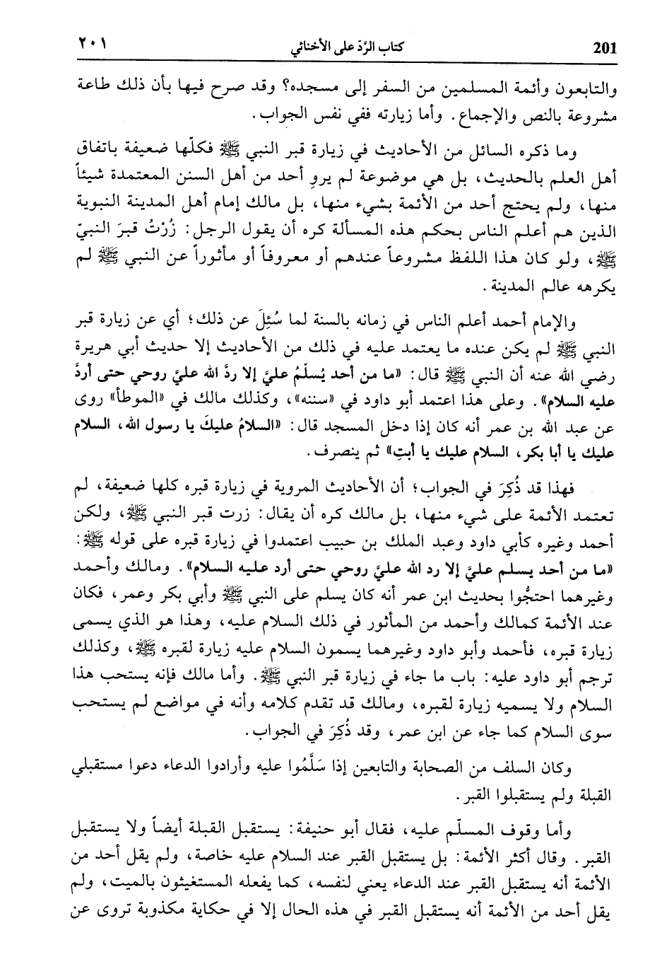 «ما من أحد يسلم عليّ إلا رد الله عليّ روحي حتى أرد عليه السلام». ومالك وأحمد وغيرهما احتجّوا بحديث ابن عمر أنه كان يسلم على النبي صلى الله عليه وسلّم وأبي بكر وعمر، فكان عند الأئمة كمالك وأحمد من المأثور في ذلك السلام عليه، وهذا هو الذي يسمى زيارة قبره، فأحمد وأبو داود وغيرهما يسمون السلام عليه زيارة لقبره صلى الله عليه وسلّم، وكذلك ترجم أبو داود عليه: باب ما جاء في زيارة قبر النبي صلى الله عليه وسلّم. وأما مالك فإنه يستحب هذا السلام ولا يسميه زيارة لقبره، ومالك قد تقدم كلامه وأنه في مواضع لم يستحب سوى السلام كما جاء عن ابن عمر، وقد ذكر في الجواب.
