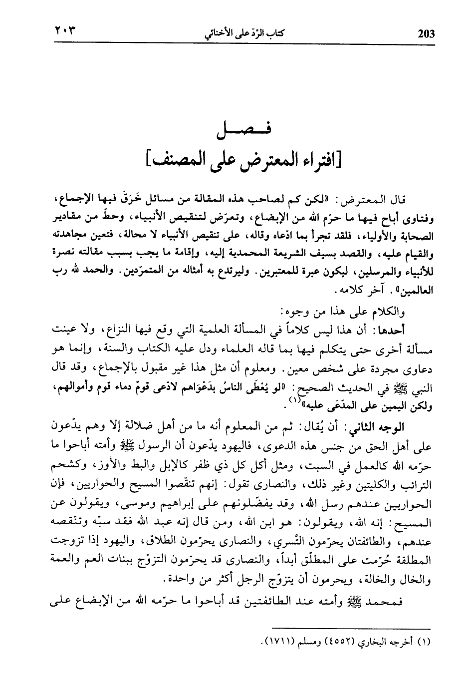 أحدها: أن هذا ليس كلاما في المسألة العلمية التي وقع فيها النزاع، ولا عينت مسألة أخرى حتى يتكلم فيها بما قاله العلماء ودل عليه الكتاب والسنة، وإنما هو دعاوى مجردة على شخص معين. ومعلوم أن مثل هذا غير مقبول بالإجماع، وقد قال النبي صلى الله عليه وسلّم في الحديث الصحيح: «لو يعطى الناس بدعواهم لادّعى قوم دماء قوم وأموالهم، ولكن اليمين على المدّعى عليه» «1».