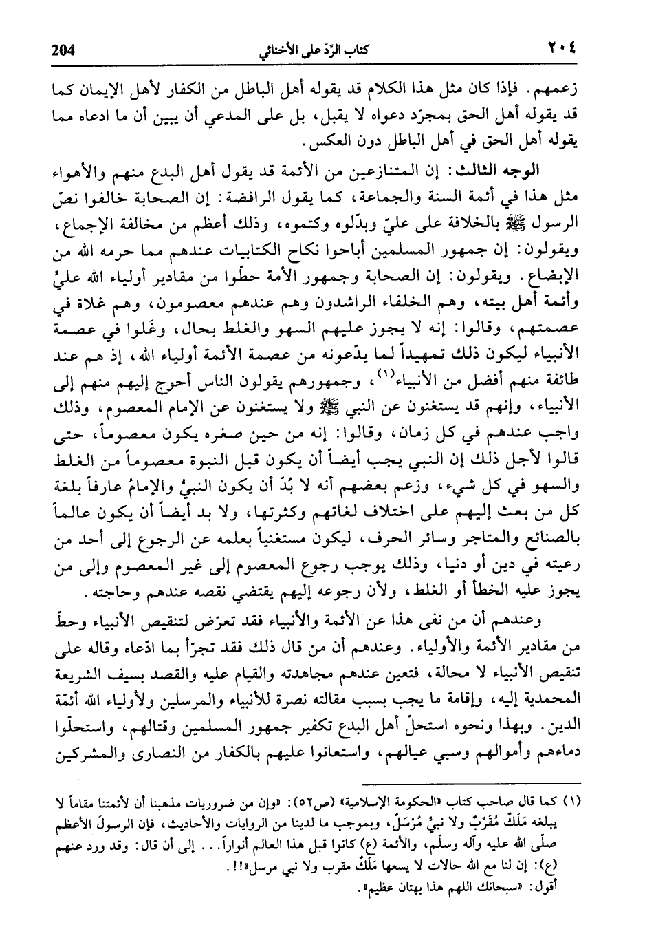 الوجه الثالث: إن المتنازعين من الأئمة قد يقول أهل البدع منهم والأهواء مثل هذا في أئمة السنة والجماعة، كما يقول الرافضة: إن الصحابة خالفوا نصّ الرسول صلى الله عليه وسلّم بالخلافة على عليّ وبدّلوه وكتموه، وذلك أعظم من مخالفة الإجماع، ويقولون: إن جمهور المسلمين أباحوا نكاح الكتابيات عندهم مما حرمه الله من الإبضاع. ويقولون: إن الصحابة وجمهور الأمة حطّوا من مقادير أولياء الله عليّ وأئمة أهل بيته، وهم الخلفاء الراشدون وهم عندهم معصومون، وهم غلاة في عصمتهم، وقالوا: إنه لا يجوز عليهم السهو والغلط بحال، وغلوا في عصمة الأنبياء ليكون ذلك تمهيدا لما يدّعونه من عصمة الأئمة أولياء الله، إذ هم عند طائفة منهم أفضل من الأنبياء «1»، وجمهورهم يقولون الناس أحوج إليهم منهم إلى الأنبياء، وإنهم قد يستغنون عن النبي صلى الله عليه وسلّم ولا يستغنون عن الإمام المعصوم، وذلك واجب عندهم في كل زمان، وقالوا: إنه من حين صغره يكون معصوما، حتى قالوا لأجل ذلك إن النبي يجب أيضا أن يكون قبل النبوة معصوما من الغلط والسهو في كل شيء، وزعم بعضهم أنه لا بدّ أن يكون النبيّ والإمام عارفا بلغة كل من بعث إليهم على اختلاف لغاتهم وكثرتها، ولا بد أيضا أن يكون عالما بالصنائع والمتاجر وسائر الحرف، ليكون مستغنيا بعلمه عن الرجوع إلى أحد من رعيته في دين أو دنيا، وذلك يوجب رجوع المعصوم إلى غير المعصوم وإلى من يجوز عليه الخطأ أو الغلط، ولأن رجوعه إليهم يقتضي نقصه عندهم وحاجته.