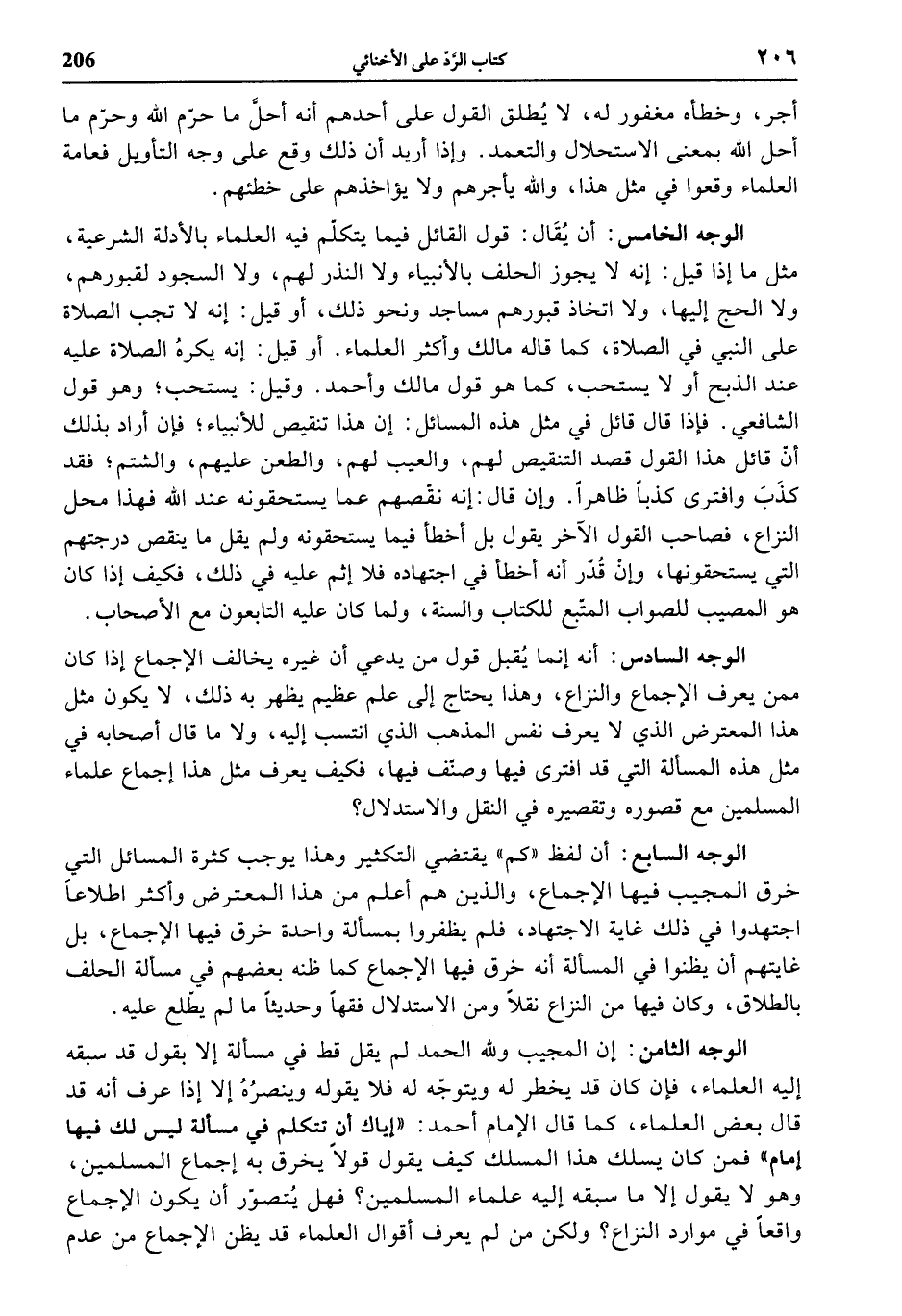 الوجه الثامن: إن المجيب ولله الحمد لم يقل قط في مسألة إلا بقول قد سبقه إليه العلماء، فإن كان قد يخطر له ويتوجّه له فلا يقوله وينصره إلا إذا عرف أنه قد قال بعض العلماء، كما قال الإمام أحمد: «إياك أن تتكلم في مسألة ليس لك فيها إمام» فمن كان يسلك هذا المسلك كيف يقول قولا يخرق به إجماع المسلمين، وهو لا يقول إلا ما سبقه إليه علماء المسلمين؟ فهل يتصوّر أن يكون الإجماع واقعا في موارد النزاع؟ ولكن من لم يعرف أقوال العلماء قد يظن الإجماع من عدم