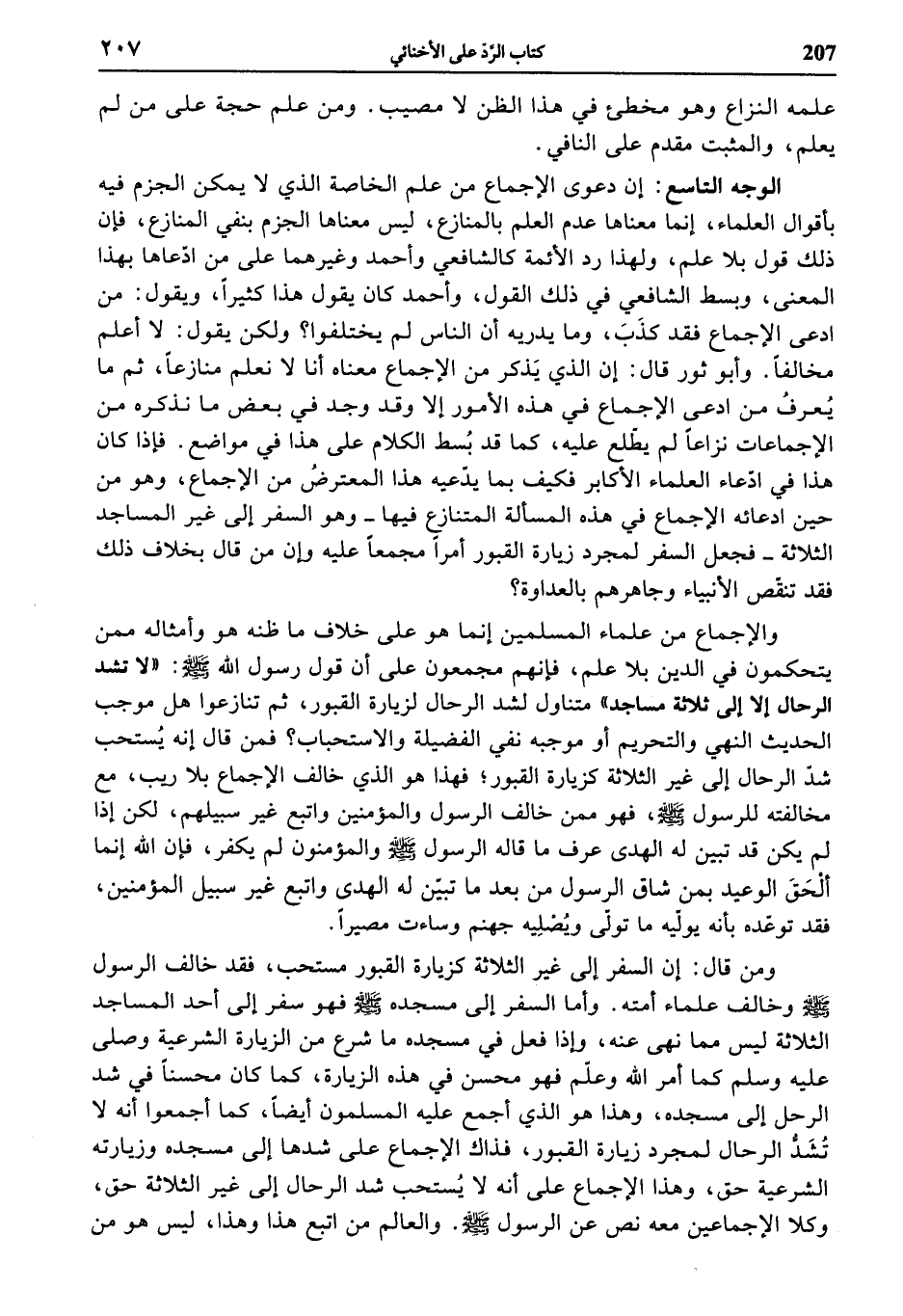 ومن قال: إن السفر إلى غير الثلاثة كزيارة القبور مستحب، فقد خالف الرسول صلى الله عليه وسلّم وخالف علماء أمته. وأما السفر إلى مسجده صلى الله عليه وسلّم فهو سفر إلى أحد المساجد الثلاثة ليس مما نهى عنه، وإذا فعل في مسجده ما شرع من الزيارة الشرعية وصلى عليه وسلم كما أمر الله وعلّم فهو محسن في هذه الزيارة، كما كان محسنا في شد الرحل إلى مسجده، وهذا هو الذي أجمع عليه المسلمون أيضا، كما أجمعوا أنه لا تشدّ الرحال لمجرد زيارة القبور، فذاك الإجماع على شدها إلى مسجده وزيارته الشرعية حق، وهذا الإجماع على أنه لا يستحب شد الرحال إلى غير الثلاثة حق، وكلا الإجماعين معه نص عن الرسول صلى الله عليه وسلّم. والعالم من اتبع هذا وهذا، ليس هو من