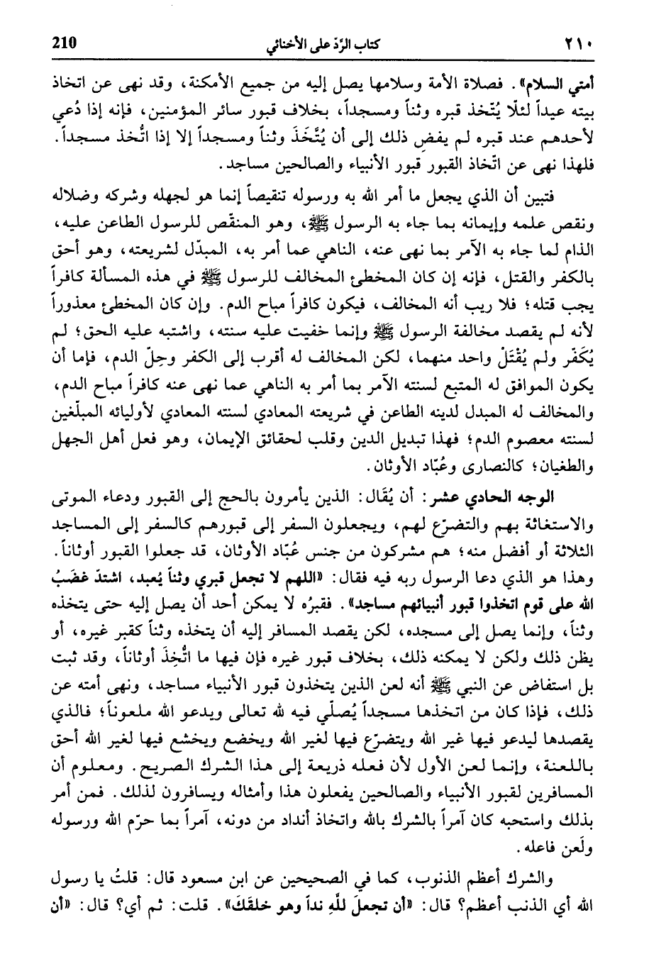 وهذا هو الذي دعا الرسول ربه فيه فقال: «اللهم لا تجعل قبري وثنا يعبد، اشتدّ غضب الله على قوم اتخذوا قبور أنبيائهم مساجد». فقبره لا يمكن أحد أن يصل إليه حتى يتخذه وحدثنا، وإنما يصل إلى مسجده، لكن يقصد المسافر إليه أن يتخذه وحدثنا كقبر غيره، أو يظن ذلك ولكن لا يمكنه ذلك، بخلاف قبور غيره فإن فيها ما اتّخذ أوثانا، وقد ثبت بل استفاض عن النبي صلى الله عليه وسلّم أنه لعن الذين يتخذون قبور الأنبياء مساجد، ونهى أمته عن ذلك، فإذا كان من اتخذها مسجدا يصلّي فيه لله تعالى ويدعو الله ملعونا؛ فالذي يقصدها ليدعو فيها غير الله ويتضرّع فيها لغير الله ويخضع ويخشع فيها لغير الله أحق باللعنة، وإنما لعن الأول لأن فعله ذريعة إلى هذا الشرك الصريح. ومعلوم أن المسافرين لقبور الأنبياء والصالحين يفعلون هذا وأمثاله ويسافرون لذلك. فمن أمر بذلك واستحبه كان آمرا بالشرك بالله واتخاذ أنداد من دونه، آمرا بما حرّم الله ورسوله ولعن فاعله.
