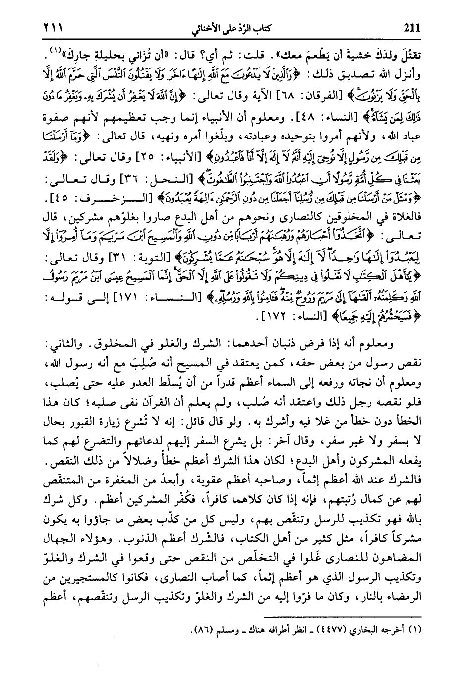 وأنزل الله تصديق ذلك: وَالَّذِينَ لا يَدْعُونَ مَعَ اللَّهِ إِلهاً آخَرَ وَلا يَقْتُلُونَ النَّفْسَ الَّتِي حَرَّمَ اللَّهُ إِلَّا بِالْحَقِّ وَلا يَزْنُونَ [الفرقان: 68] الآية وقال تعالى: إِنَّ اللَّهَ لا يَغْفِرُ أَنْ يُشْرَكَ بِهِ وَيَغْفِرُ ما دُونَ ذلِكَ لِمَنْ يَشاءُ [النساء: 48]. ومعلوم أن الأنبياء إنما وجب تعظيمهم لأنهم صفوة عباد الله، ولأنهم أمروا بتوحيده وعبادته، وبلّغوا أمره ونهيه، قال تعالى: وَما أَرْسَلْنا مِنْ قَبْلِكَ مِنْ رَسُولٍ إِلَّا نُوحِي إِلَيْهِ أَنَّهُ لا إِلهَ إِلَّا أَنَا فَاعْبُدُونِ [الأنبياء: 25] وقال تعالى: وَلَقَدْ بَعَثْنا فِي كُلِّ أُمَّةٍ رَسُولًا أَنِ اعْبُدُوا اللَّهَ وَاجْتَنِبُوا الطَّاغُوتَ [النحل: 36] وقال تعالى: