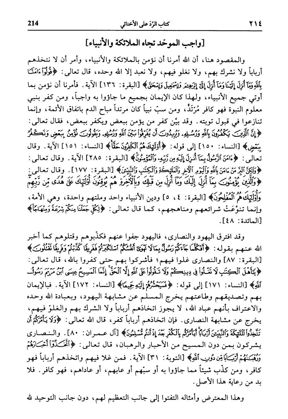 يا أَهْلَ الْكِتابِ لا تَغْلُوا فِي دِينِكُمْ وَلا تَقُولُوا عَلَى اللَّهِ إِلَّا الْحَقَّ إِنَّمَا الْمَسِيحُ عِيسَى ابْنُ مَرْيَمَ رَسُولُ اللَّهِ [النساء: 171] إلى قوله: فَسَيَحْشُرُهُمْ إِلَيْهِ جَمِيعاً [النساء: 172] الآية. فبالإيمان بهم وتصديقهم وطاعتهم يخرج المسلم عن مشابهة اليهود، وبعبادة الله وحده والاعتراف بأنهم عباد الله، لا يجوز اتخاذهم أربابا ولا الشرك بهم والغلوّ فيهم، يخرج عن مشابهة النصارى. فإن اتخاذهم أربابا كفر، قال الله تعالى: وَلا يَأْمُرَكُمْ أَنْ تَتَّخِذُوا الْمَلائِكَةَ وَالنَّبِيِّينَ أَرْباباً أَيَأْمُرُكُمْ بِالْكُفْرِ بَعْدَ إِذْ أَنْتُمْ مُسْلِمُونَ [آل عمران: 80]. والنصارى يشركون بمن دون المسيح من الأحبار والرهبان، قال تعالى: اتَّخَذُوا أَحْبارَهُمْ وَرُهْبانَهُمْ أَرْباباً مِنْ دُونِ اللَّهِ [التوبة: 31] الآية. فمن غلا فيهم واتخذهم أربابا فهو كافر، ومن كذّب شيئا مما جاءوا به أو سبّهم أو عابهم، أو عاداهم، فهو كافر. فلا بد من رعاية هذا الأصل.
