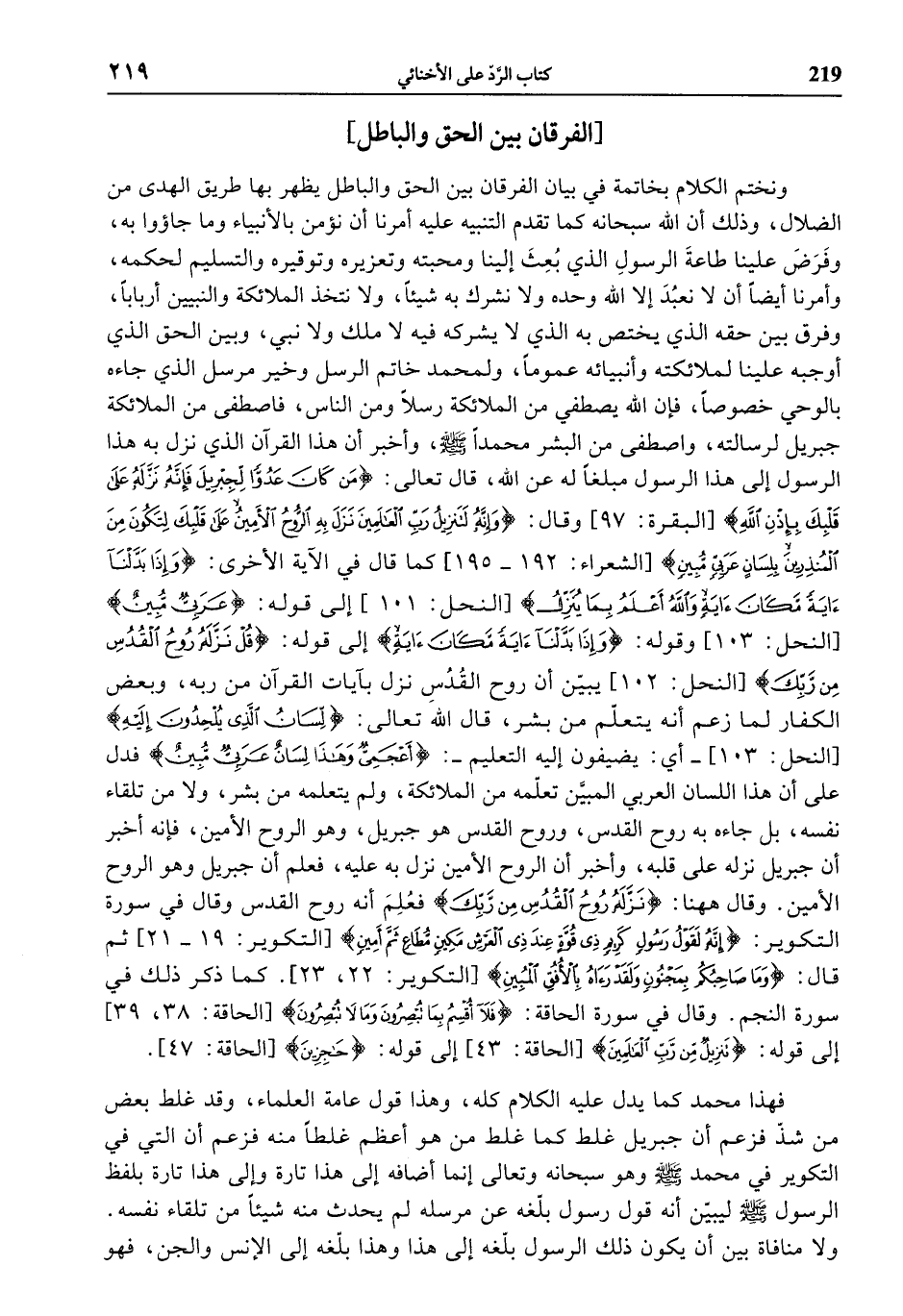 ونختم الكلام بخاتمة في بيان الفرقان بين الحق والباطل يظهر بها طريق الهدى من الضلال، وذلك أن الله سبحانه كما تقدم التنبيه عليه أمرنا أن نؤمن بالأنبياء وما جاءوا به، وفرض علينا طاعة الرسول الذي بعث إلينا ومحبته وتعزيره وتوقيره والتسليم لحكمه، وأمرنا أيضا أن لا نعبد إلا الله وحده ولا نشرك به شيئا، ولا نتخذ الملائكة والنبيين أربابا، وفرق بين حقه الذي يختص به الذي لا يشركه فيه لا ملك ولا نبي، وبين الحق الذي أوجبه علينا لملائكته وأنبيائه عموما، ولمحمد خاتم الرسل وخير مرسل الذي جاءه بالوحي خصوصا، فإن الله يصطفي من الملائكة رسلا ومن الناس، فاصطفى من الملائكة جبريل لرسالته، واصطفى من البشر محمدا صلى الله عليه وسلّم، وأخبر أن هذا القرآن الذي نزل به هذا الرسول إلى هذا الرسول مبلغا له عن الله، قال تعالى: مَنْ كانَ عَدُوًّا لِجِبْرِيلَ فَإِنَّهُ نَزَّلَهُ عَلى قَلْبِكَ بِإِذْنِ اللَّهِ [البقرة: 97] وقال: وَإِنَّهُ لَتَنْزِيلُ رَبِّ الْعالَمِينَ نَزَلَ بِهِ الرُّوحُ الْأَمِينُ عَلى قَلْبِكَ لِتَكُونَ مِنَ الْمُنْذِرِينَ بِلِسانٍ عَرَبِيٍّ مُبِينٍ [الشعراء: 192 - 195] كما قال في الآية الأخرى: وَإِذا بَدَّلْنا آيَةً مَكانَ آيَةٍ وَاللَّهُ أَعْلَمُ بِما يُنَزِّلُ [النحل: 101] إلى قوله: عَرَبِيٌّ مُبِينٌ [النحل: 103] وقوله: وَإِذا بَدَّلْنا آيَةً مَكانَ آيَةٍ إلى قوله: قُلْ نَزَّلَهُ رُوحُ الْقُدُسِ مِنْ رَبِّكَ [النحل: 102] يبيّن أن روح القدس نزل بآيات القرآن من ربه، وبعض الكفار لما زعم أنه يتعلّم من بشر، قال الله تعالى: لِسانُ الَّذِي يُلْحِدُونَ إِلَيْهِ [النحل: 103]- أي: يضيفون إليه التعليم-: أَعْجَمِيٌّ وَهذا لِسانٌ عَرَبِيٌّ مُبِينٌ فدل على أن هذا اللسان العربي المبيّن تعلّمه من الملائكة، ولم يتعلمه من بشر، ولا من تلقاء نفسه، بل جاءه به روح القدس، وروح القدس هو جبريل، وهو الروح الأمين، فإنه أخبر أن جبريل نزله على قلبه، وأخبر أن الروح الأمين نزل به عليه، فعلم أن جبريل وهو الروح الأمين. وقال هاهنا: نَزَّلَهُ رُوحُ الْقُدُسِ مِنْ رَبِّكَ فعلم أنه روح القدس وقال في سورة التكوير: إِنَّهُ لَقَوْلُ رَسُولٍ كَرِيمٍ ذِي قُوَّةٍ عِنْدَ ذِي الْعَرْشِ مَكِينٍ مُطاعٍ ثَمَّ أَمِينٍ [التكوير: 19 - 21] ثم قال: وَما صاحِبُكُمْ بِمَجْنُونٍ وَلَقَدْ رَآهُ بِالْأُفُقِ الْمُبِينِ [التكوير: 22، 23]. كما ذكر ذلك في سورة النجم. وقال في سورة الحاقة: فَلا أُقْسِمُ بِما تُبْصِرُونَ وَما لا تُبْصِرُونَ [الحاقة: 38، 39] إلى قوله: تَنْزِيلٌ مِنْ رَبِّ الْعالَمِينَ [الحاقة: 43] إلى قوله: حاجِزِينَ [الحاقة: 47].