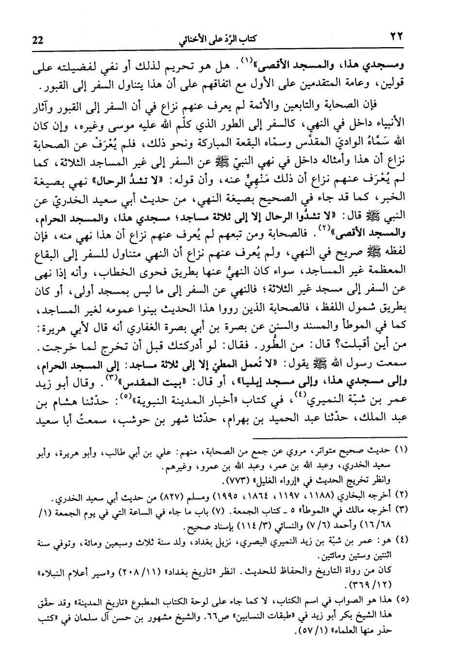 فإن الصحابة والتابعين والأئمة لم يعرف عنهم نزاع في أن السفر إلى القبور وآثار الأنبياء داخل في النهي، كالسفر إلى الطور الذي كلّم الله عليه موسى وغيره، وإن كان الله سمّاه الوادي المقدّس وسمّاه البقعة المباركة ونحو ذلك، فلم يعرف عن الصحابة نزاع أن هذا وأمثاله داخل في نهي النبيّ صلى الله عليه وسلّم عن السفر إلى غير المساجد الثلاثة، كما لم يعرف عنهم نزاع أن ذلك منهيّ عنه، وأن قوله: «لا تشدّ الرحال» نهي بصيغة الخبر، كما قد جاء في الصحيح بصيغة النهي، من حديث أبي سعيد الخدريّ عن النبي صلى الله عليه وسلّم قال: «لا تشدّوا الرحال إلا إلى ثلاثة مساجد؛ مسجدي هذا، والمسجد الحرام، والمسجد الأقصى» «2». فالصحابة ومن تبعهم لم يعرف عنهم نزاع أن هذا نهي منه، فإن لفظه صلى الله عليه وسلّم صريح في النهي، ولم يعرف عنهم نزاع أن النهي متناول للسفر إلى البقاع المعظمة غير المساجد، سواء كان النهي عنها بطريق فحوى الخطاب، وأنه إذا نهى عن السفر إلى مسجد غير الثلاثة؛ فالنهي عن السفر إلى ما ليس بمسجد أولى، أو كان بطريق شمول اللفظ، فالصحابة الذين رووا هذا الحديث بينوا عمومه لغير المساجد، كما في الموطأ والمسند والسنن عن بصرة بن أبي بصرة الغفاري أنه قال لأبي هريرة: