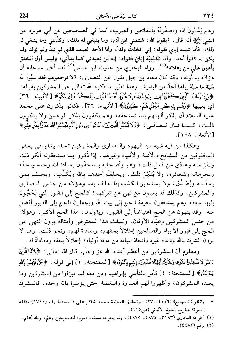 وهكذا من فيه شبه من اليهود والنصارى والمشركين تجده يغلو في بعض المخلوقين من المشايخ والأئمة والأنبياء وغيرهم، إذا ذكروا بما يستحقونه أنكر ذلك ونفر منه وعادى من فعل ذلك، وهو وأصحابه يستخفّون بعبادة الله وحده وبحقّه وبحرماته وشعائره، ولا ينكر ذلك. ويحلف أحدهم بالله ويكذّب، ويحلف بمن يعظّمه ويصدّق، ولا يستجيز الكذب إذا حلف به، وهؤلاء من جنس النصارى والمشركين. وكذلك قد يعيبون من نهى عن شركهم؛ كالحج إلى القبور التي يحجّون إليها عادة، وهم يستخفون بحرمة الحج إلى بيت الله ويجعلون الحج إلى القبور أفضل منه. وقد ينهون عن الحج اعتياضا إلى القبور، ويقولون: هذا الحج الأكبر، وهؤلاء من جنس المشركين وعبّاد الأوثان. وكذلك هذا المعترض وأمثاله يرون النهي عن الحج إلى قبور الأنبياء والصالحين إخلالا بحقهم، ومعاداة لهم، ونحو ذلك. وهم لا يرون الشرك بالله ودعاء غيره واتخاذ عباده من دونه أولياء؛ إخلالا بحقه ومعاداة له.