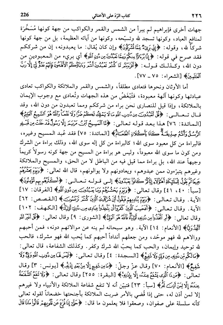 أما الأوثان ونحوها فتعادى مطلقا، والشمس والقمر والملائكة والكواكب تعادى عبادتها وكونها آلهة معبودة، فتبغض من هذه الجهات وتعادى مع وجوب الإيمان بالملائكة، وإذا قيل للنصارى نحن براء من شرككم ومما تعبدون من دون الله، وقد قال تعالى: قُلْ أَتَعْبُدُونَ مِنْ دُونِ اللَّهِ ما لا يَمْلِكُ لَكُمْ ضَرًّا وَلا نَفْعاً وَاللَّهُ هُوَ السَّمِيعُ الْعَلِيمُ [المائدة: 76] هذا بعد قوله تعالى: مَا الْمَسِيحُ ابْنُ مَرْيَمَ إِلَّا رَسُولٌ قَدْ خَلَتْ مِنْ قَبْلِهِ الرُّسُلُ وَأُمُّهُ صِدِّيقَةٌ كانا يَأْكُلانِ الطَّعامَ [المائدة: 75] فقد عبد المسيح وغيره، فالبراءة من كل معبود سوى الله؛ كالبراءة من كل إله سوى الله، وذلك براءة من الشرك ومن كون ما سوى الله معبودا، وليس هو براءة من المسيح من جهة كونه رسولا كريما وجيها عند الله، بل براءة مما قيل فيه من الباطل لا من الحق، والمسيح والملائكة وغيرهم يتبرّءون ممن عبدوهم، ويعادونهم ولا يوالونهم، قال الله تعالى: وَيَوْمَ يَحْشُرُهُمْ جَمِيعاً ثُمَّ يَقُولُ لِلْمَلائِكَةِ أَهؤُلاءِ إِيَّاكُمْ كانُوا يَعْبُدُونَ إلى قوله تعالى: أَكْثَرُهُمْ بِهِمْ مُؤْمِنُونَ [سبأ: 40، 41] وقال تعالى: وَيَوْمَ يَحْشُرُهُمْ وَما يَعْبُدُونَ مِنْ دُونِ اللَّهِ [الفرقان: 17] الآية. وقال تعالى: وَيَوْمَ يُنادِيهِمْ فَيَقُولُ أَيْنَ شُرَكائِيَ الَّذِينَ كُنْتُمْ تَزْعُمُونَ [القصص: 62] الآية. وقال تعالى: أَفَحَسِبَ الَّذِينَ كَفَرُوا أَنْ يَتَّخِذُوا عِبادِي مِنْ دُونِي أَوْلِياءَ [الكهف: 102] وقال تعالى: أَمِ اتَّخَذُوا مِنْ دُونِهِ أَوْلِياءَ فَاللَّهُ هُوَ الْوَلِيُ [الشورى: 9] وقال تعالى: قُلْ أَغَيْرَ اللَّهِ أَتَّخِذُ وَلِيًّا [الأنعام: 14] الآية. وهو سبحانه لم ينه عن موالاتهم دونه، فمن أحبهم ووالاهم لله فهو موحّد، ومن جعلهم أندادا أحبهم كما يحب الله فهو مشرك، فالحب لله توحيد وإيمان، والحب كما يحبّ الله شرك وكفر. وكذلك الشفاعة، قال تعالى:
