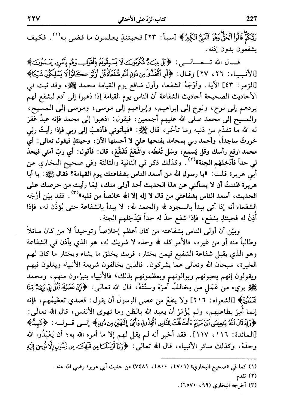 قال الله تعالى: بَلْ عِبادٌ مُكْرَمُونَ لا يَسْبِقُونَهُ بِالْقَوْلِ وَهُمْ بِأَمْرِهِ يَعْمَلُونَ [الأنبياء: 26، 27] وقال: أَمِ اتَّخَذُوا مِنْ دُونِ اللَّهِ شُفَعاءَ قُلْ أَوَلَوْ كانُوا لا يَمْلِكُونَ شَيْئاً [الزمر: 43] الآية. وأوجه الشفعاء وأول شافع يوم القيامة محمد صلى الله عليه وسلّم، وقد ثبت في الأحاديث الصحيحة أحاديث الشفاعة أن الناس يوم القيامة إذا ذهبوا إلى آدم ليشفع لهم يردهم إلى نوح، ونوح إلى إبراهيم، وإبراهيم إلى موسى، وموسى إلى المسيح، والمسيح إلى محمد صلى الله عليهم أجمعين، فيقول: اذهبوا إلى محمد فإنه عبد غفر له الله ما تقدّم من ذنبه وما تأخّر، قال صلى الله عليه وسلّم: «فيأتوني فأذهب إلى ربي فإذا رأيت ربّي خررت ساجدا، وأحمد ربي بمحامد يفتحها عليّ لا أحسنها الآن، وحينئذ فيقول تعالى: أي محمد ارفع رأسك وقل يسمع، وسل تعطه، واشفع تشفّع، قال: فأقول: أي ربّ أمتي فيحدّ لي حدا فأدخلهم الجنة» «2». وكذلك ذكر في الثانية والثالثة وفي صحيح البخاري عن أبي هريرة قلت: «يا رسول الله من أسعد الناس بشفاعتك يوم القيامة؟ فقال صلى الله عليه وسلّم: يا أبا هريرة ظننت أن لا يسألني عن هذا الحديث أحد أولى منك، لما رأيت من حرصك على الحديث، أسعد الناس بشفاعتي من قال لا إله إلا الله خالصا من قلبه» «3». فقد بيّن أوجه الشفعاء أنه إذا أتى يبدأ بالسجود لله والحمد لله، لا يبدأ بالشفاعة حتى يؤذن له، فإذا أذن له فحينئذ يشفع، فإذا شفع حدّ له حدا فيدخلهم الجنة.