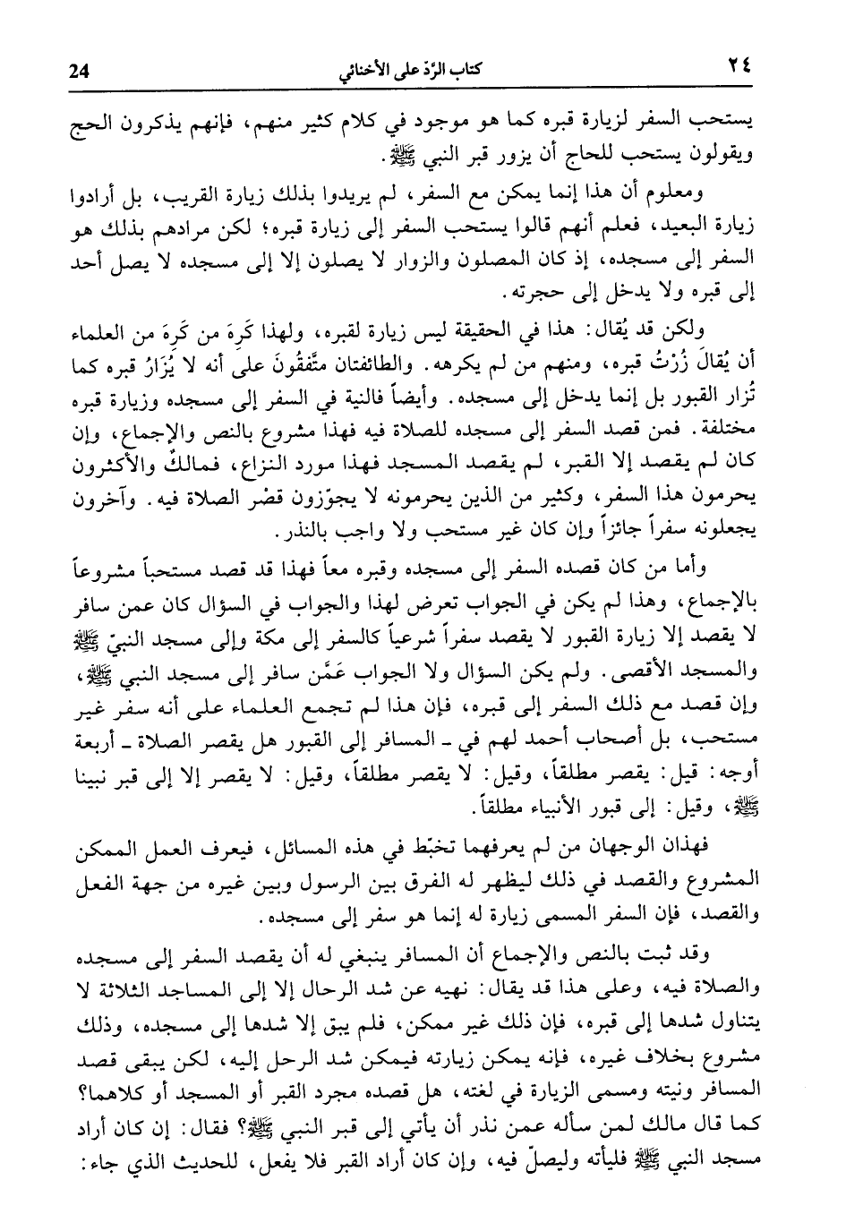 ومعلوم أن هذا إنما يمكن مع السفر، لم يريدوا بذلك زيارة القريب، بل أرادوا زيارة البعيد، فعلم أنهم قالوا يستحب السفر إلى زيارة قبره؛ لكن مرادهم بذلك هو السفر إلى مسجده، إذ كان المصلون والزوار لا يصلون إلا إلى مسجده لا يصل أحد إلى قبره ولا يدخل إلى حجرته.