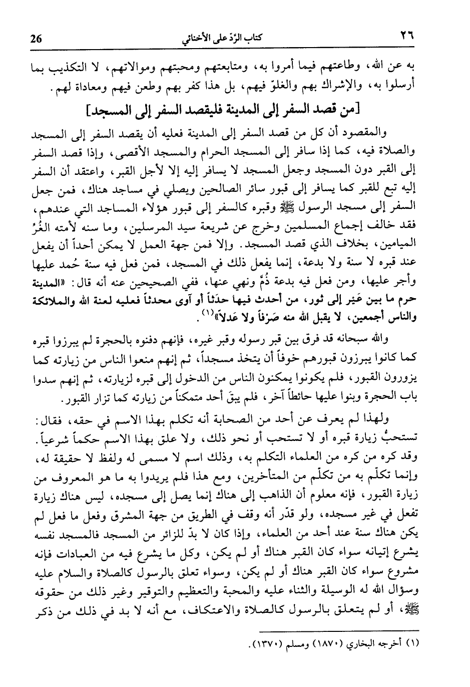 والمقصود أن كل من قصد السفر إلى المدينة فعليه أن يقصد السفر إلى المسجد والصلاة فيه، كما إذا سافر إلى المسجد الحرام والمسجد الأقصى، وإذا قصد السفر إلى القبر دون المسجد وجعل المسجد لا يسافر إليه إلا لأجل القبر، واعتقد أن السفر إليه تبع للقبر كما يسافر إلى قبور سائر الصالحين ويصلي في مساجد هناك، فمن جعل السفر إلى مسجد الرسول صلى الله عليه وسلّم وقبره كالسفر إلى قبور هؤلاء المساجد التي عندهم، فقد خالف إجماع المسلمين وخرج عن شريعة سيد المرسلين، وما سنه لأمته الغرّ الميامين، بخلاف الذي قصد المسجد. وإلا فمن جهة العمل لا يمكن أحدا أن يفعل عند قبره لا سنة ولا بدعة، إنما يفعل ذلك في المسجد، فمن فعل فيه سنة حمد عليها وأجر عليها، ومن فعل فيه بدعة ذمّ ونهي عنها، ففي الصحيحين عنه أنه قال: «المدينة حرم ما بين عير إلى ثور، من أحدث فيها حدثا أو آوى محدثا فعليه لعنة الله والملائكة والناس أجمعين، لا يقبل الله منه صرفا ولا عدلا» «1».