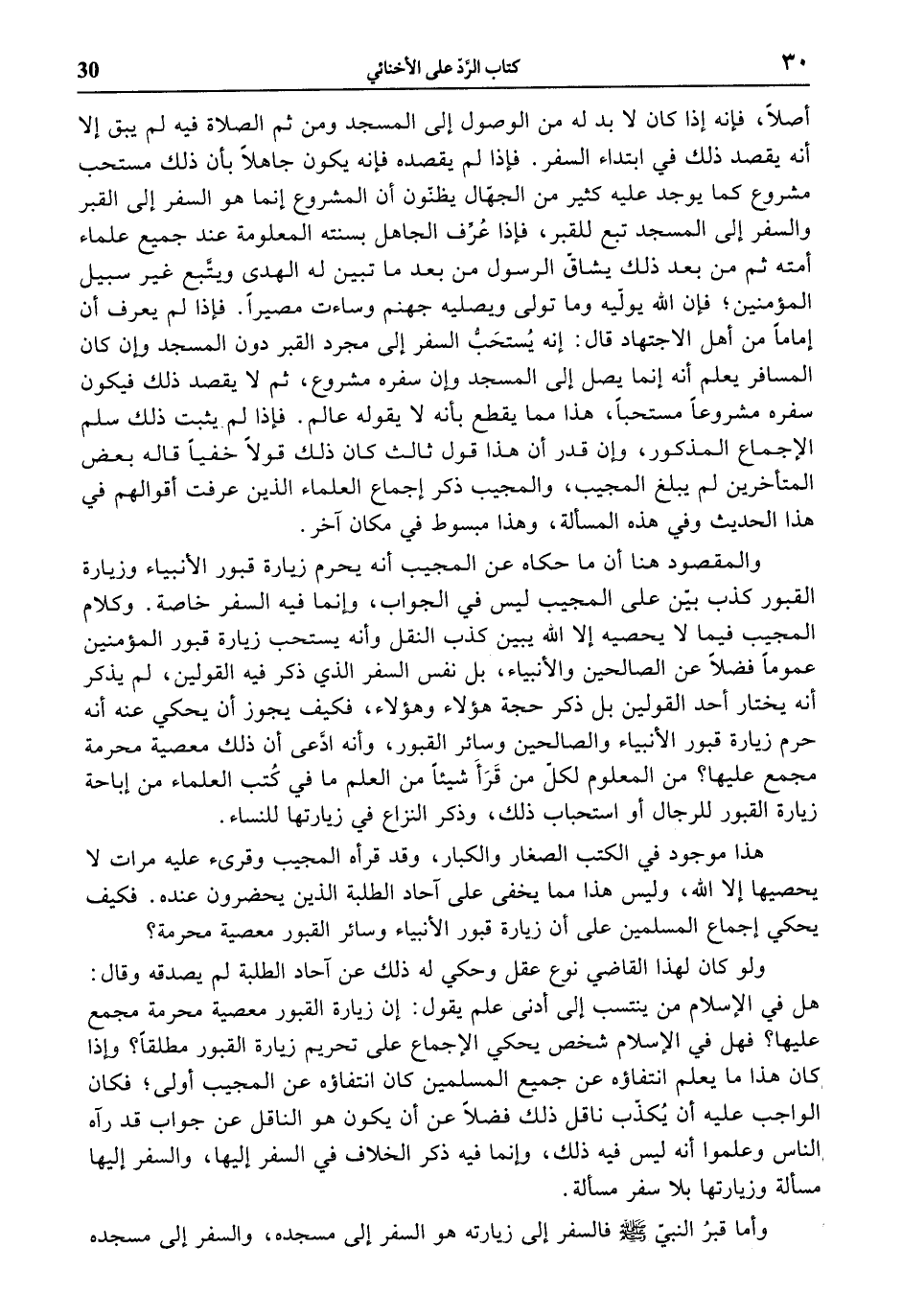 هذا موجود في الكتب الصغار والكبار، وقد قرأه المجيب وقرئ عليه مرات لا يحصيها إلا الله، وليس هذا مما يخفى على آحاد الطلبة الذين يحضرون عنده. فكيف يحكي إجماع المسلمين على أن زيارة قبور الأنبياء وسائر القبور معصية محرمة؟
