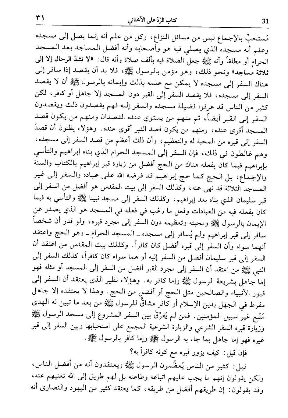 مستحبّ بالإجماع ليس من مسائل النزاع، وكل من علم أنه إنما يصل إلى مسجده وعلم أنه مسجده الذي يصلي فيه هو وأصحابه وأنه أفضل المساجد بعد المسجد الحرام أو مطلقا وأنه صلى الله عليه وسلّم جعل الصلاة فيه بألف صلاة وأنه قال: «لا تشدّ الرحال إلا إلى ثلاثة مساجد» ونحو ذلك، وهو مؤمن بالرسول صلى الله عليه وسلّم، فلا بد أن يقصد إذا سافر إلى هناك السفر إلى مسجده لا يمكن مع علمه بذلك وإيمانه بالرسول صلى الله عليه وسلّم أن لا يقصد السفر إلى مسجده، فلا يقصد السفر إلى القبر دون المسجد إلا جاهل أو كافر، لكن كثير من الناس قد عرفوا فضيلة مسجده والسفر إليه فهم يقصدون ذلك ويقصدون السفر إلى القبر أيضا، ثم منهم من يستوي عنده القصدان ومنهم من يكون قصد المسجد أقوى عنده، ومنهم من يكون قصد القبر أقوى عنده. وهؤلاء يظنون أن قصد السفر إلى قبره من المحبة له والتعظيم، وأن ذلك أعظم من قصد السفر إلى مسجده، وهم غالطون في ذلك، فإن السفر إلى المسجد الحرام الذي بناه إبراهيم والتأسي بإبراهيم فيما كان يفعله هناك من الحج أفضل من زيارة قبر إبراهيم بالكتاب والسنة والإجماع، بل الحج كما حج إبراهيم قد فرضه الله على عباده والسفر إلى غير المساجد الثلاثة قد نهى عنه، وكذلك السفر إلى بيت المقدس هو أفضل من السفر إلى قبر سليمان الذي بناه بعد إبراهيم، وكذلك السفر إلى مسجد نبينا صلى الله عليه وسلّم والتأسي به فيما كان يفعله فيه من العبادات وفعل ما رغب في فعله في المسجد هو الذي يصدر عن الإيمان بالرسول صلى الله عليه وسلّم ومحبته وتعظيمه دون السفر إلى مجرد قبره، ولو قدر أن شخصا سافر إلى قبر إبراهيم ولم يسافر إلى مسجده- المسجد الحرام- وهو الحج واعتقد أنهما سواء وأن السفر إلى قبره أفضل كان كافرا. وكذلك بيت المقدس من اعتقد أن السفر إلى قبر سليمان أفضل من السفر إليه أو هما سواء كان كافرا، كذلك السفر إلى النبي صلى الله عليه وسلّم من اعتقد أن السفر إلى مجرد القبر أفضل من السفر إلى المسجد أو مثله فهو إما جاهل بشريعة الرسول صلى الله عليه وسلّم وإما كافر به. وهؤلاء نظير الذي يعتقد أن السفر إلى قبور الأنبياء والصالحين مثل الحج أو أفضل من الحج. وهذا لا يعتقده إلا جاهل مفرط في الجهل بدين الإسلام أو كافر مشاقّ للرسول صلى الله عليه وسلّم من بعد ما تبين له الهدى متّبع غير سبيل المؤمنين. فمن لم يفرّق بين السفر المشروع إلى مسجد الرسول صلى الله عليه وسلّم وزيارة قبره السفر الشرعي والزيارة الشرعية المجمع على استحبابها وبين السفر إلى قبر غيره فهو إما جاهل بما جاء به الرسول صلى الله عليه وسلّم وإما كافر بالرسول صلى الله عليه وسلّم.