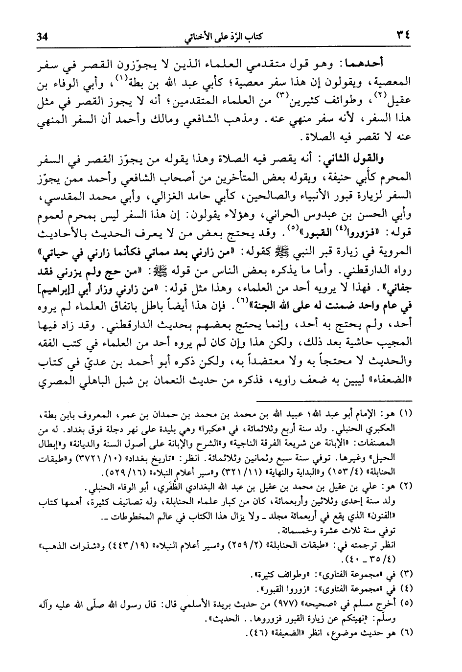 والقول الثاني: أنه يقصر فيه الصلاة وهذا يقوله من يجوّز القصر في السفر المحرم كأبي حنيفة، ويقوله بعض المتأخرين من أصحاب الشافعي وأحمد ممن يجوّز السفر لزيارة قبور الأنبياء والصالحين، كأبي حامد الغزالي، وأبي محمد المقدسي، وأبي الحسن بن عبدوس الحراني، وهؤلاء يقولون: إن هذا السفر ليس بمحرم لعموم قوله: «فزوروا «4» القبور» «5». وقد يحتج بعض من لا يعرف الحديث بالأحاديث المروية في زيارة قبر النبي صلى الله عليه وسلّم كقوله: «من زارني بعد مماتي فكأنما زارني في حياتي» رواه الدارقطني. وأما ما يذكره بعض الناس من قوله صلى الله عليه وسلّم: «من حج ولم يزرني فقد جفاني». فهذا لا يرويه أحد من العلماء، وهذا مثل قوله: «من زارني وزار أبي [إبراهيم] في عام واحد ضمنت له على الله الجنة» «6». فإن هذا أيضا باطل باتفاق العلماء لم يروه أحد، ولم يحتج به أحد، وإنما يحتج بعضهم بحديث الدارقطني. وقد زاد فيها المجيب حاشية بعد ذلك، ولكن هذا وإن كان لم يروه أحد من العلماء في كتب الفقه والحديث لا محتجا به ولا معتضدا به، ولكن ذكره أبو أحمد بن عديّ في كتاب «الضعفاء» ليبين به ضعف راويه، فذكره من حديث النعمان بن شبل الباهلي المصري