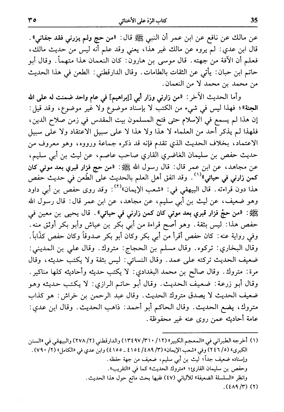 وأما الحديث الآخر: «من زارني وزار أبي [إبراهيم] في عام واحد ضمنت له على الله الجنة»؛ فهذا ليس في شيء من الكتب لا بإسناد موضوع ولا غير موضوع، وقد قيل:
