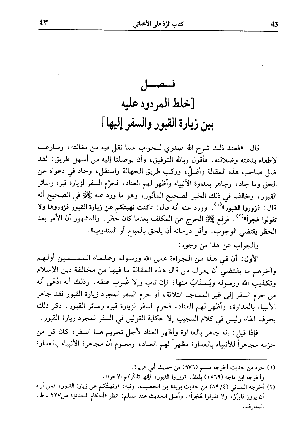 قال: «فعند ذلك شرح الله صدري للجواب عما نقل فيه من مقالته، وسارعت لإطفاء بدعته وضلالته. فأقول وبالله التوفيق، وأن يوصلنا إليه من أسهل طريق: لقد ضل صاحب هذه المقالة وأضلّ، وركب طريق الجهالة واستقل، وحاد في دعواه عن الحق وما جاد، وجاهر بعداوة الأنبياء وأظهر لهم العناد، فحرّم السفر لزيارة قبره وسائر القبور، وخالف في ذلك الخبر الصحيح المأثور، وهو ما ورد عنه صلى الله عليه وسلّم في الصحيح أنه قال: «زوروا القبور» «1». وورد عنه أنه قال: «كنت نهيتكم عن زيارة القبور فزوروها ولا تقولوا هجرا» «2». فرفع صلى الله عليه وسلّم الحرج عن المكلف بعد ما كان حظر. والمشهور أن الأمر بعد الحظر يقتضي الوجوب. وأقل درجاته أن يلحق بالمباح أو المندوب».