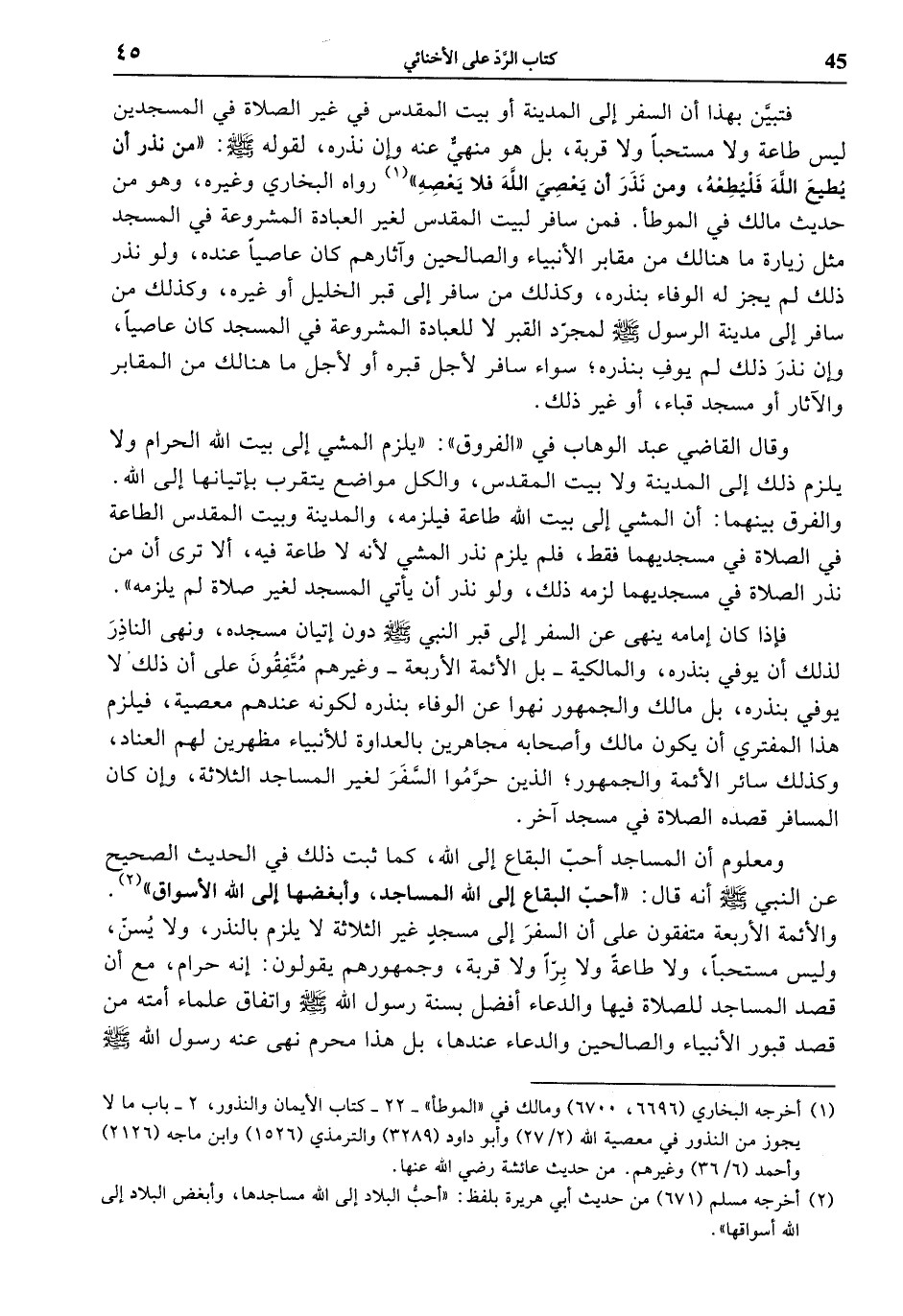 والأئمة الأربعة متفقون على أن السفر إلى مسجد غير الثلاثة لا يلزم بالنذر، ولا يسنّ، وليس مستحبا، ولا طاعة ولا برّا ولا قربة، وجمهورهم يقولون: إنه حرام، مع أن قصد المساجد للصلاة فيها والدعاء أفضل بسنة رسول الله صلى الله عليه وسلّم واتفاق علماء أمته من قصد قبور الأنبياء والصالحين والدعاء عندها، بل هذا محرم نهى عنه رسول الله صلى الله عليه وسلّم