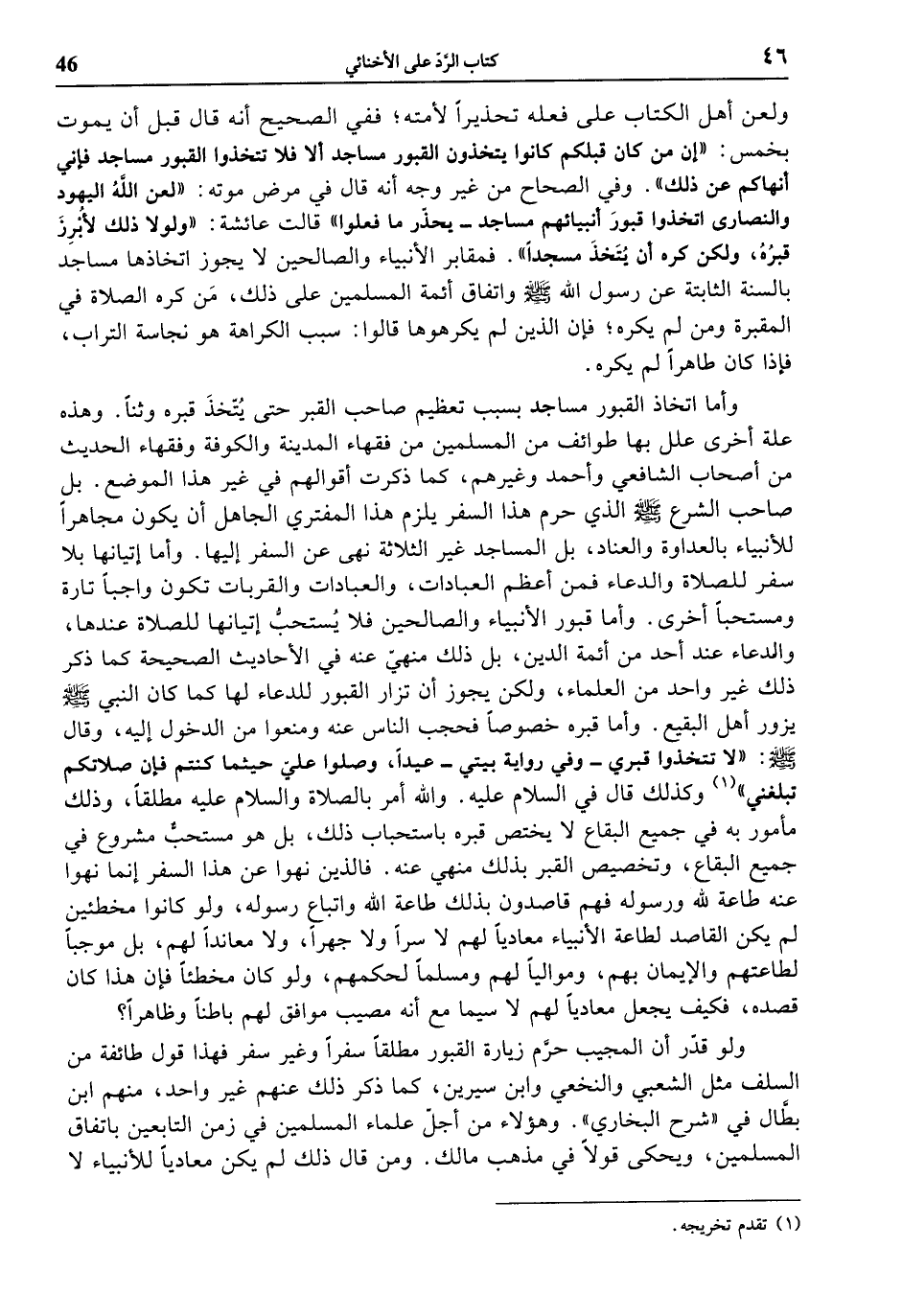 ولو قدّر أن المجيب حرّم زيارة القبور مطلقا سفرا وغير سفر فهذا قول طائفة من السلف مثل الشعبي والنخعي وابن سيرين، كما ذكر ذلك عنهم غير واحد، منهم ابن بطّال في «شرح البخاري». وهؤلاء من أجلّ علماء المسلمين في زمن التابعين باتفاق المسلمين، ويحكى قولا في مذهب مالك. ومن قال ذلك لم يكن معاديا للأنبياء لا